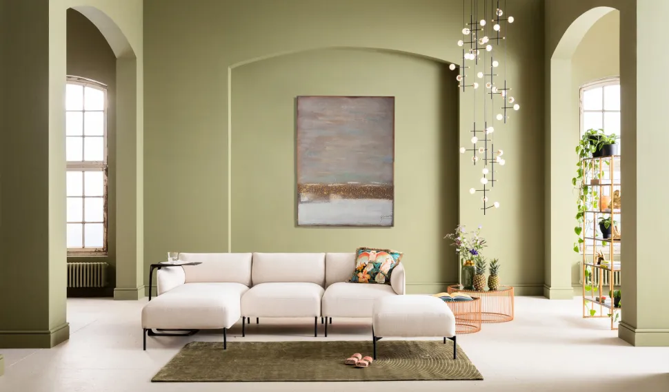 - Das Bildmotiv spielt mit gedämpften, natürlichen Farben in Graublau und Erdtönen