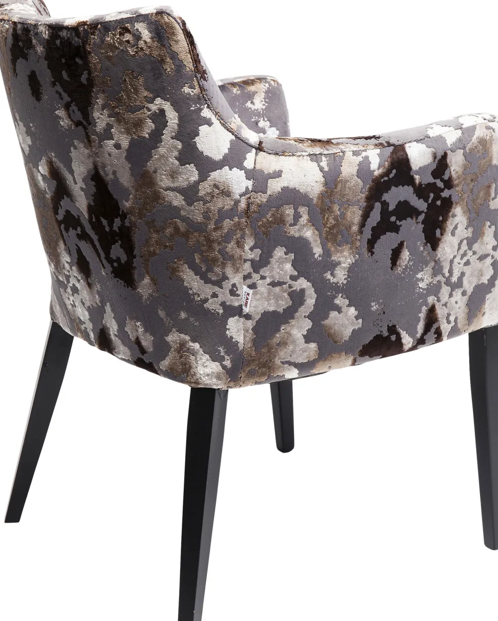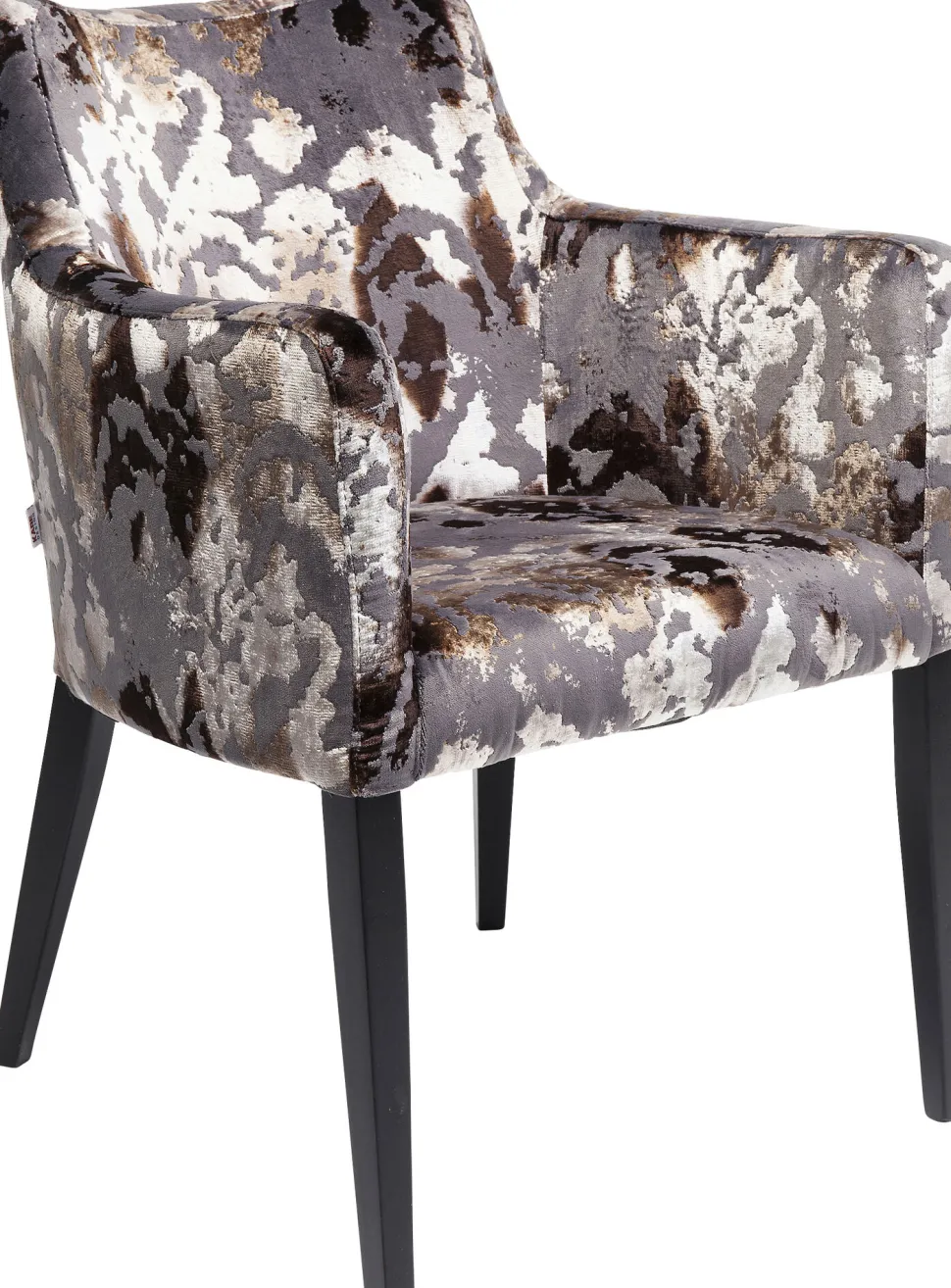 - Ein moderner Klassiker ist dieser geradlinige Polsterstuhl mit hohen Armlehnen – hier mit einem samtigen Bezugsstoff – ein Hingucker!