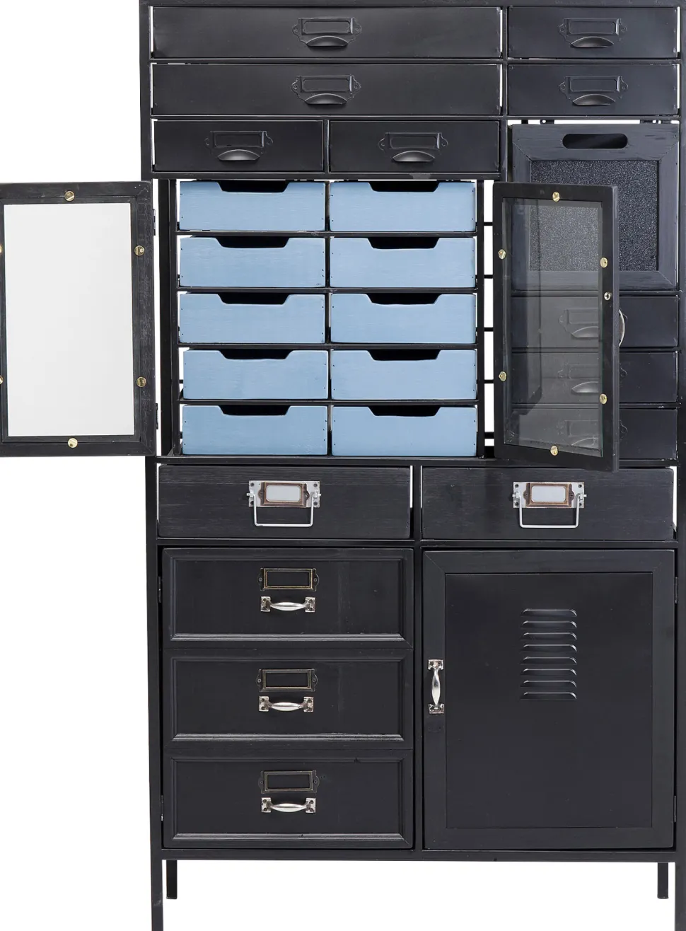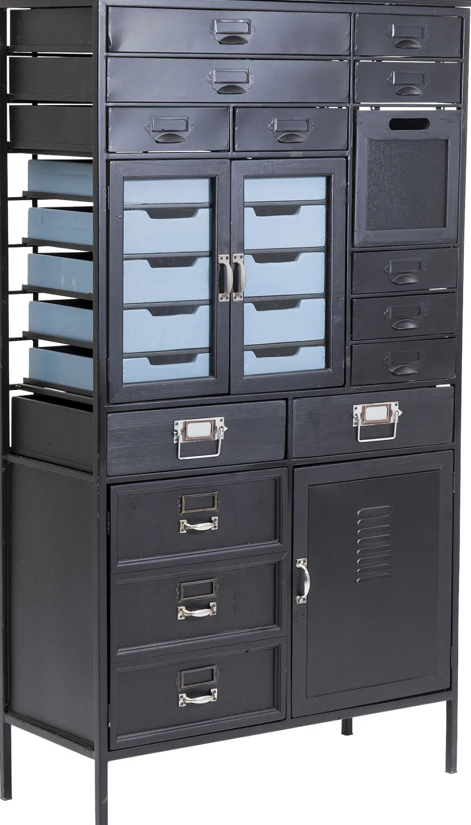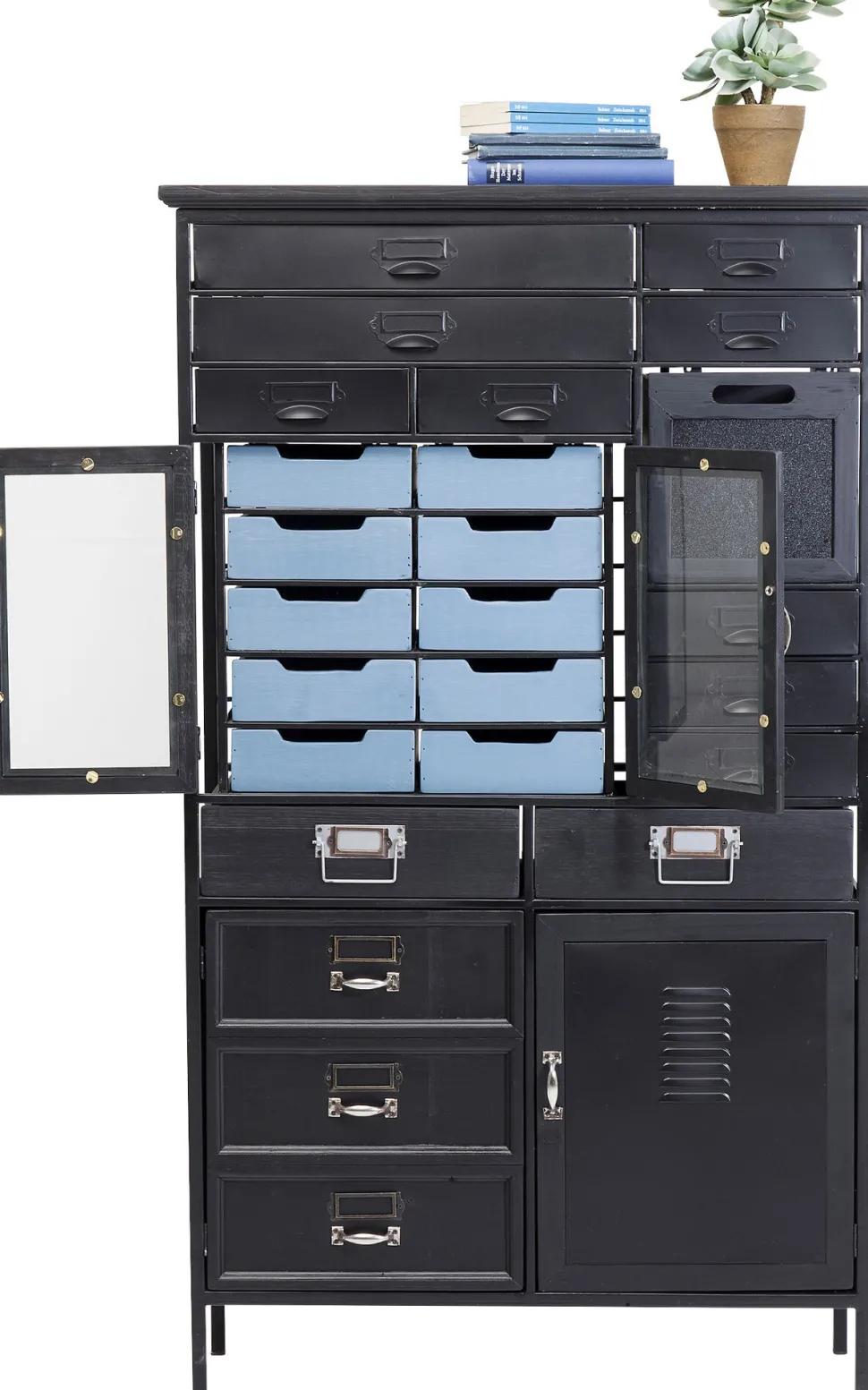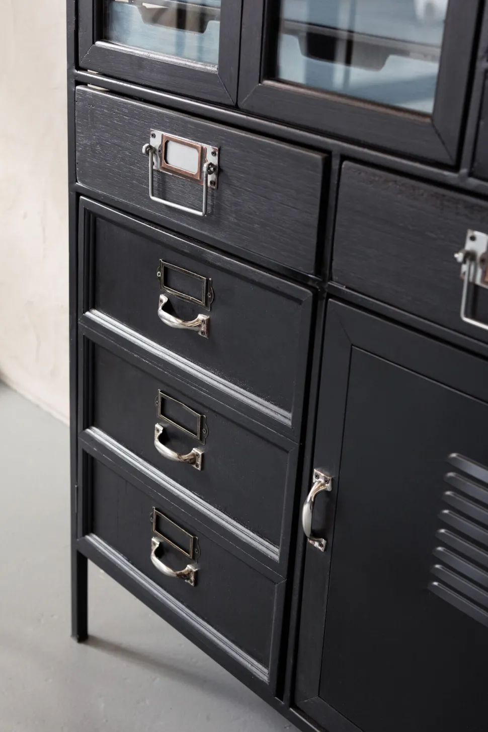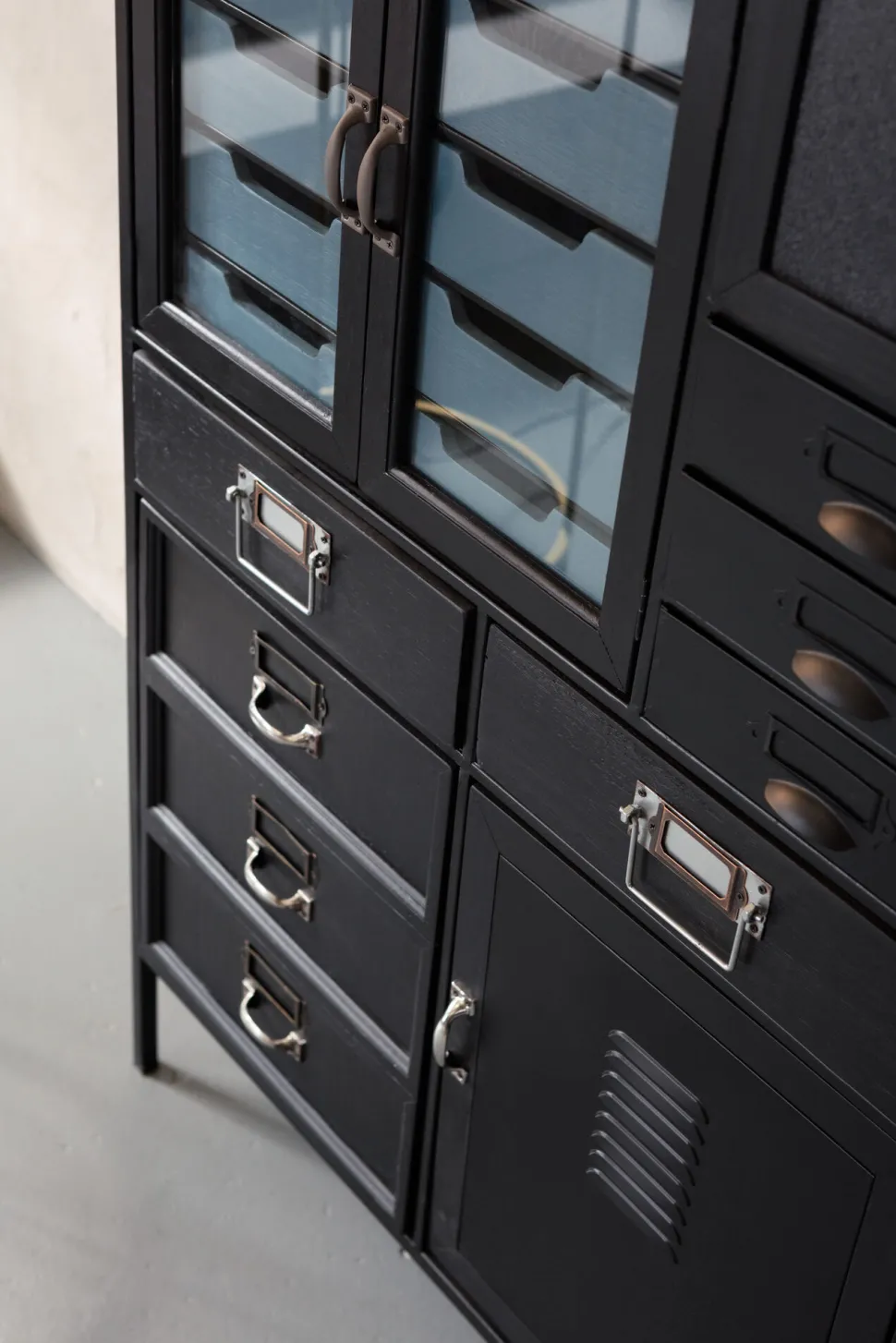 - Hoher Schubladenschrank mit schwarz lackierten Fronten aus Stahl und vielen liebevollen Details
