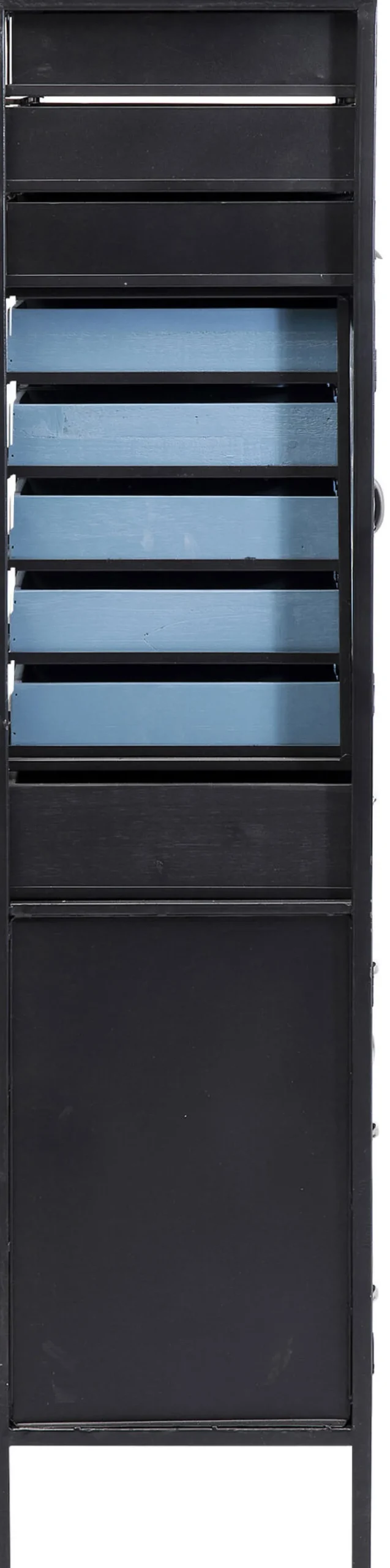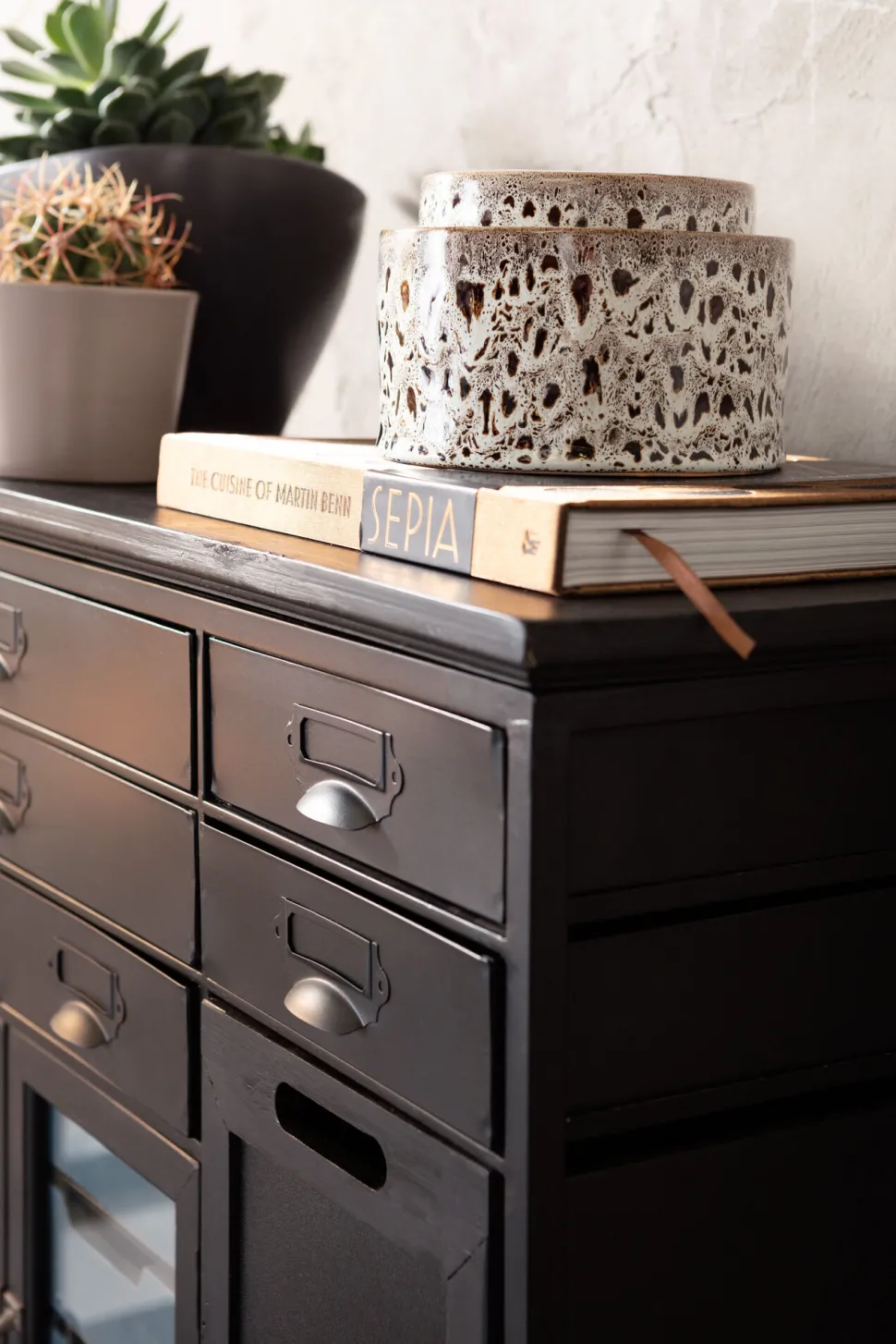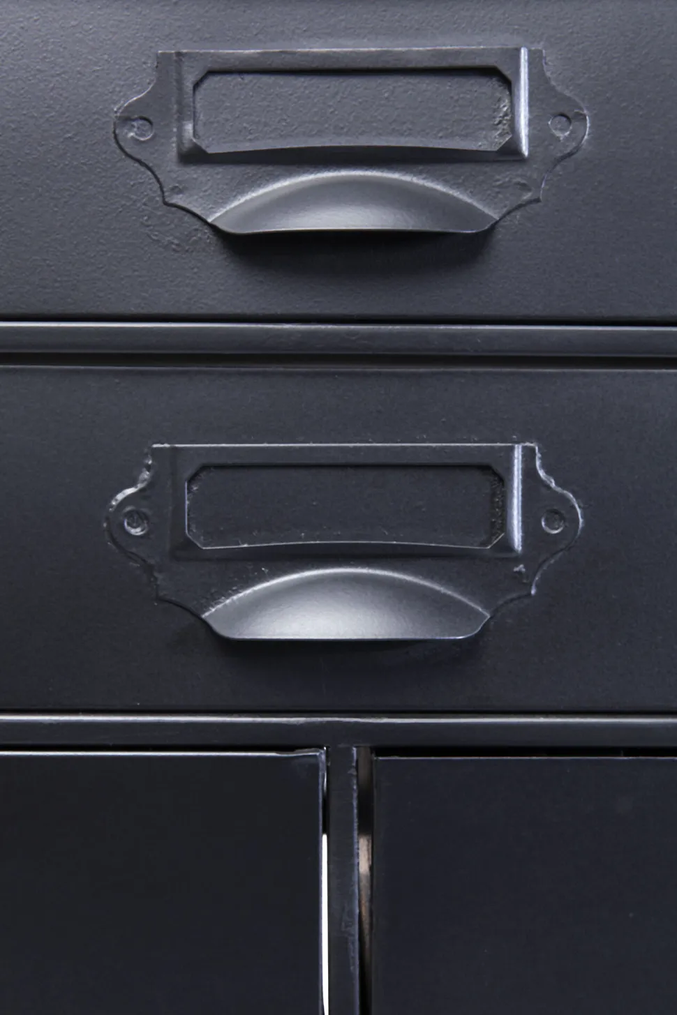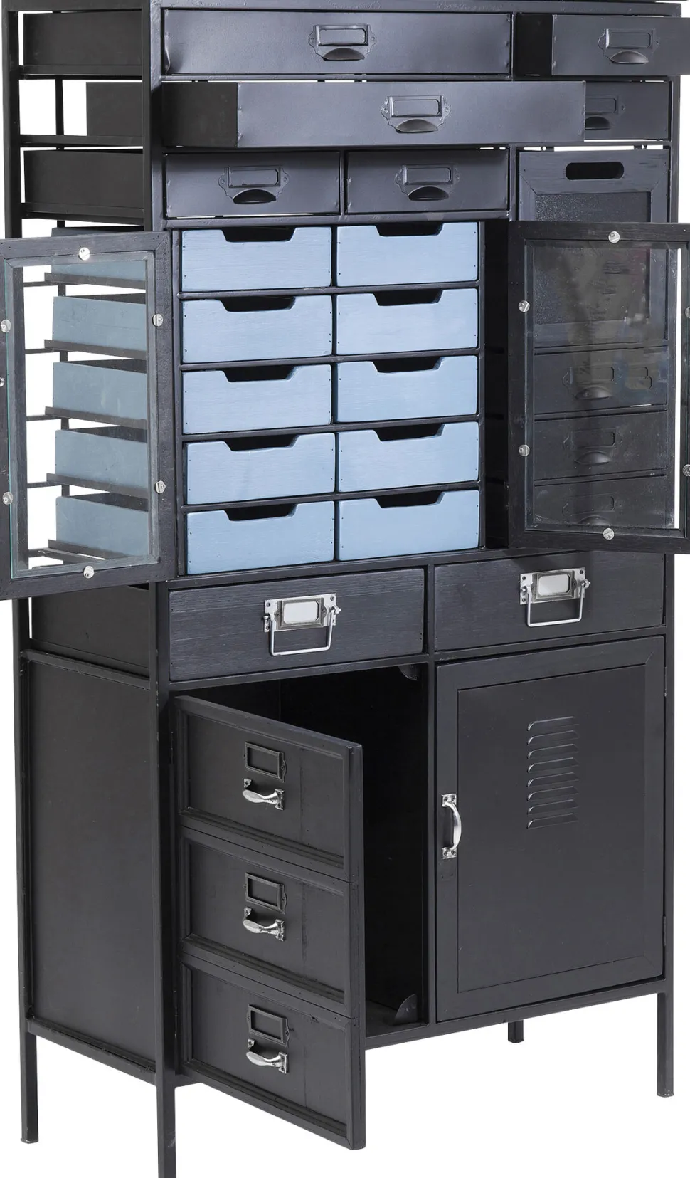 - Hoher Schubladenschrank mit schwarz lackierten Fronten aus Stahl und vielen liebevollen Details