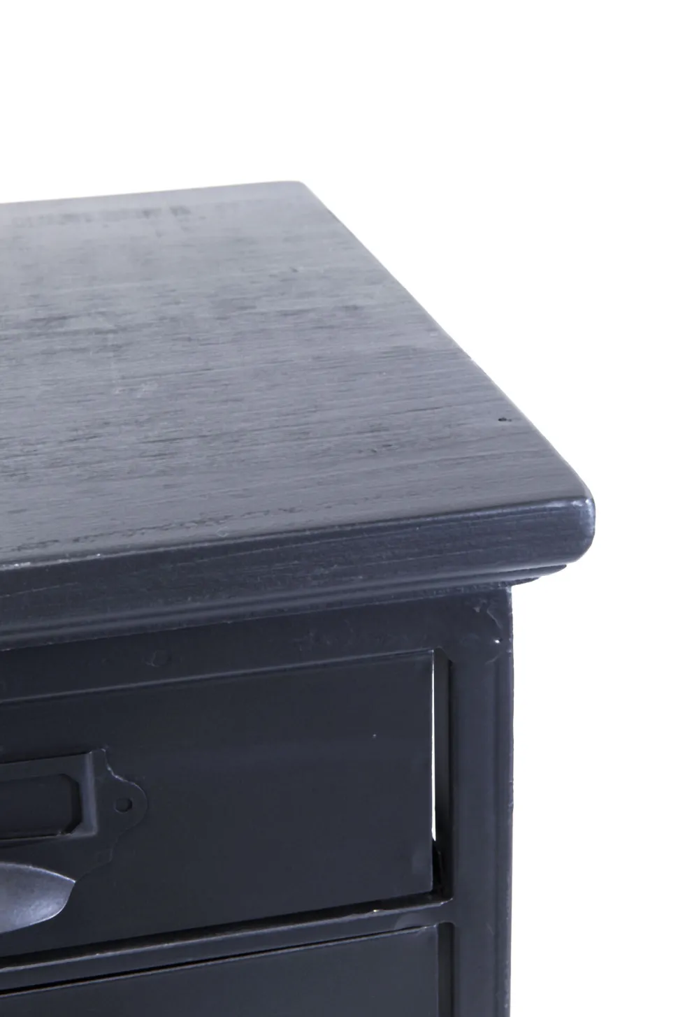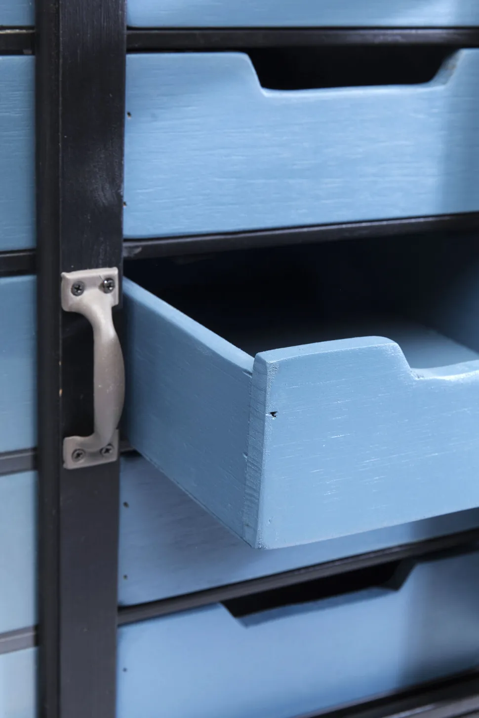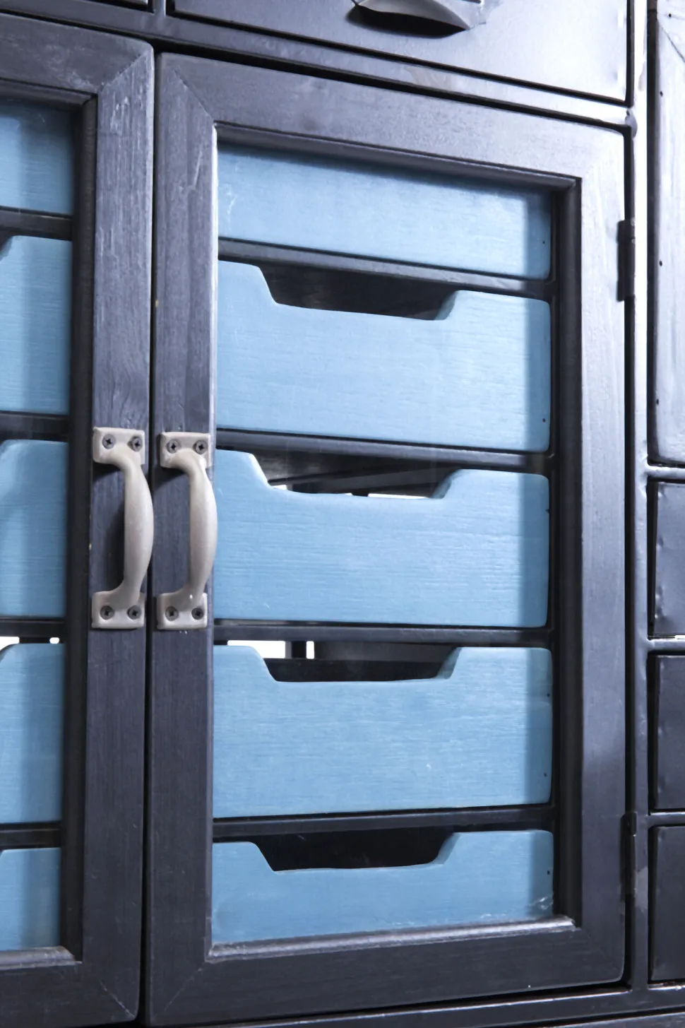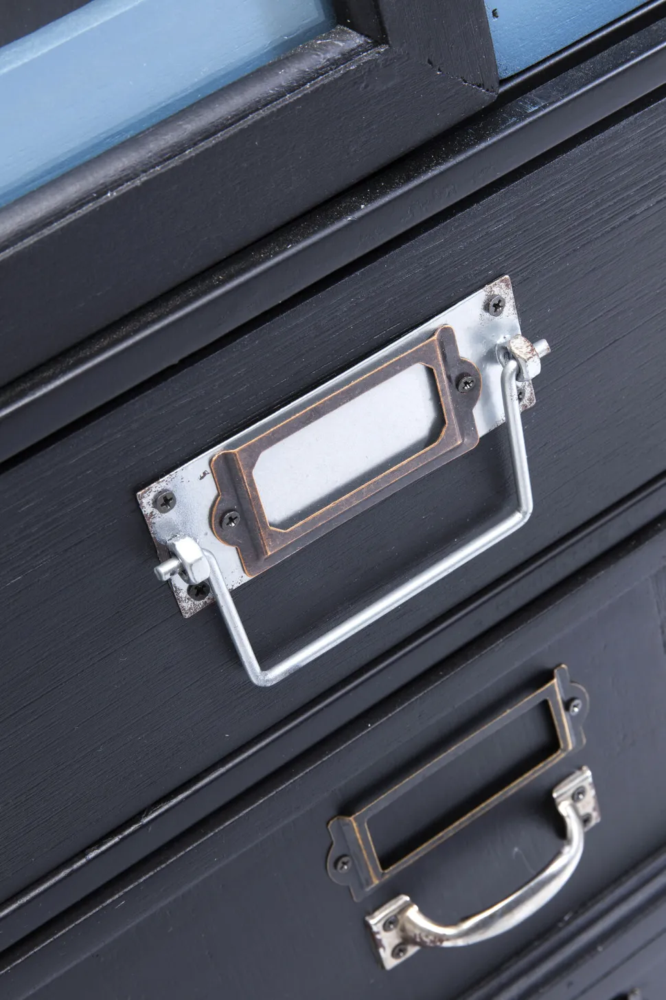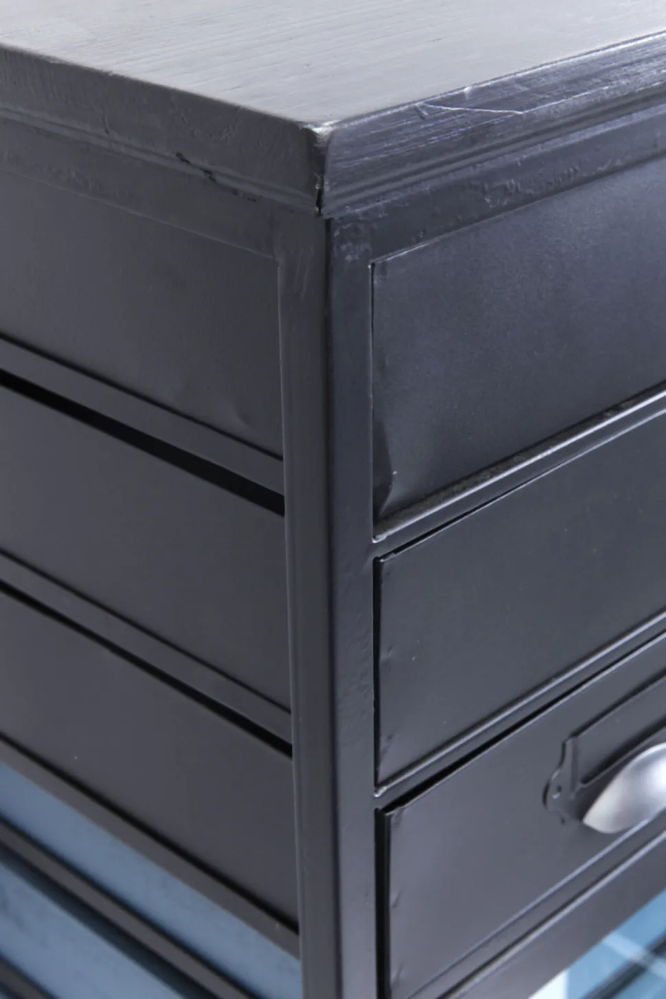 - Hoher Schubladenschrank mit schwarz lackierten Fronten aus Stahl und vielen liebevollen Details