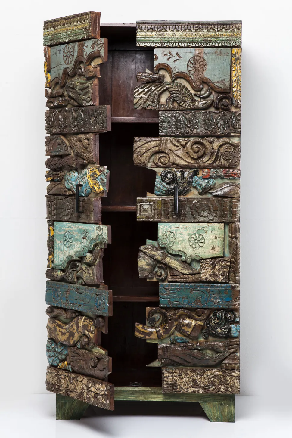 Es sind die Details, die Dinge zum Leben erwecken. Wie eine reich verzierte Wand aus phantasievoll geschnitzten Motiven und Ornamenten – so präsentiert sich dieser prachtvolle und mystisch anmutende Schrank aus der KARE Serie Shanti. Mit viel Fantasie erzählt dieser Schrank märchenhafte Geschichten, die von verborgenen Schätzen, Prophezeiungen und einer Romantik handeln, die in all ihrer Schönheit dargestellt wird. Diesen Rätseln auf der Spur lassen sich bemerkenswerte Details entdecken, wie Ornamente und florale Motive. Damit überrascht und fasziniert Shanti Surprise immer wieder und vermittelt Lebensfreude. Die Serie Shanti erzählt die Geschichte der hunderte Jahre alten Handwerkskunst des Schnitzens in Indien. Unser Design-Team hat direkt vor Ort in der Werkstatt die Idee entwickelt, wie aus Puzzle-Stücken Möbelfronten zu schaffen. Wir haben bewusst mit den rauen, ursprünglichen Formen gearbeitet, damit die Geschichte einer Handwerkskunst unverfälscht ins Heute getragen wird und der Charme und die einmalige Aura erhalten bleiben. Auch als Kommode erhältlich. Pflege: Bücherregal: Trocken abstauben. Bei Reliefoberflächen aus Holz eignet sich eine weiche Kleiderbürste, um aus den Rillen Staub zu entfernen. Mit dem weichen Bürstenaufsatz Ihres Staubsaugers gelegentlich vorsichtig absaugen. Einzigartige Handarbeit aus Naturmaterial: Es zeichnet natürliche Materialien aus, dass sie auch nach ihrer Verarbeitung weiter leben, auf Hitze, Feuchtigkeit oder starkes Sonnenlicht reagieren können. Diese Lebensspuren sind gewollt und Bestandteil eines authentischen Möbels.Material: (Mango Massivholz gewachst)