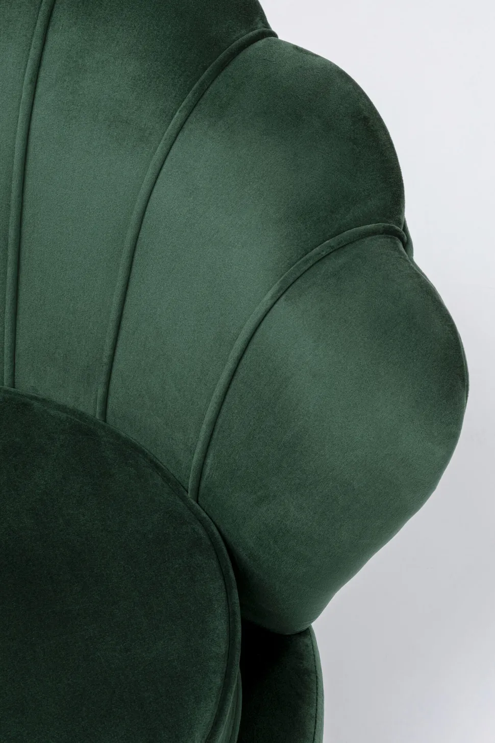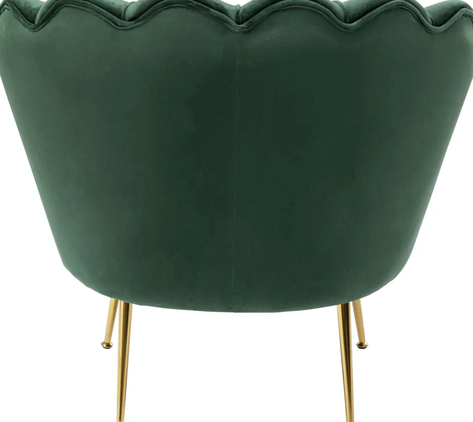 - Von der Form eines zarten Blütenkelches inspiriert: In herrlichem Tannengrün schimmert dieser samtige Cocktail-Sessel auf messingfarbenen Beinen