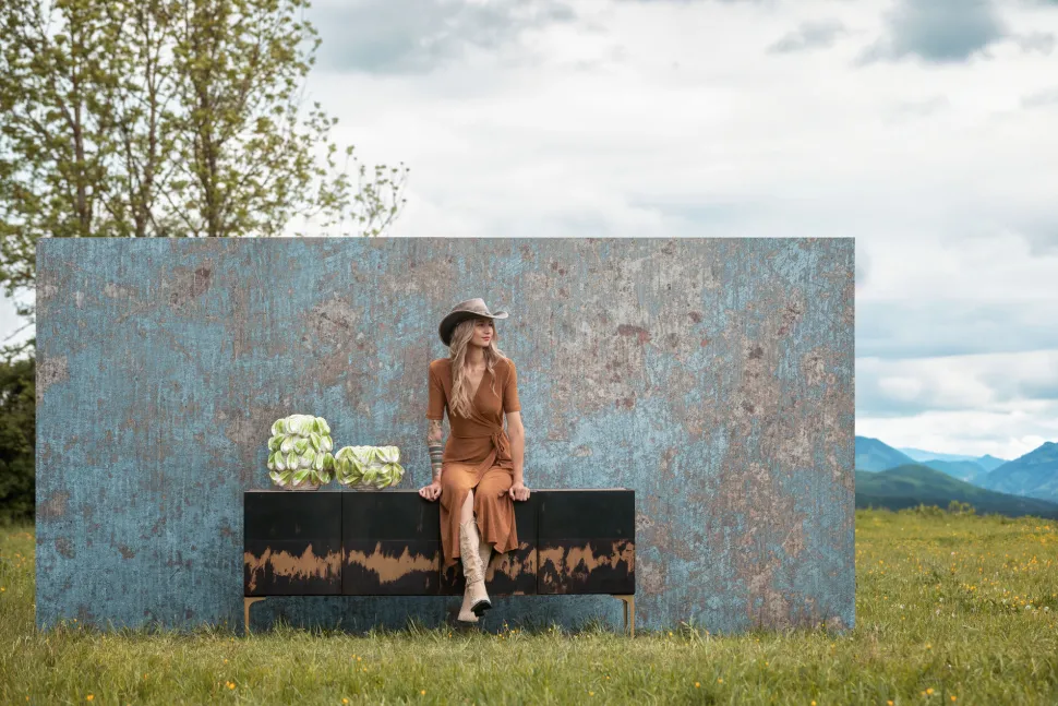 - Kunstvolle Vase, die durch die aufgesetzten Früchte besticht