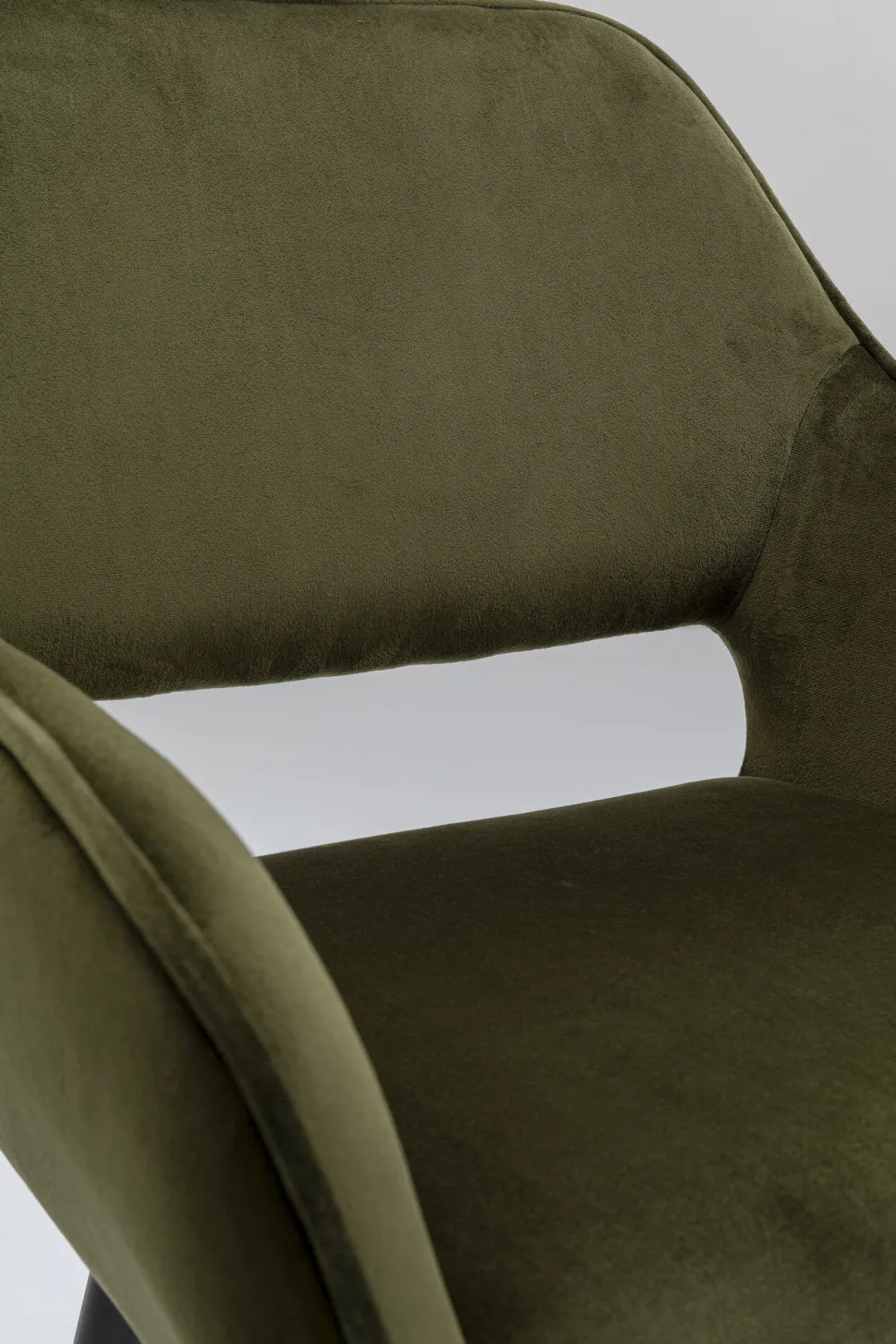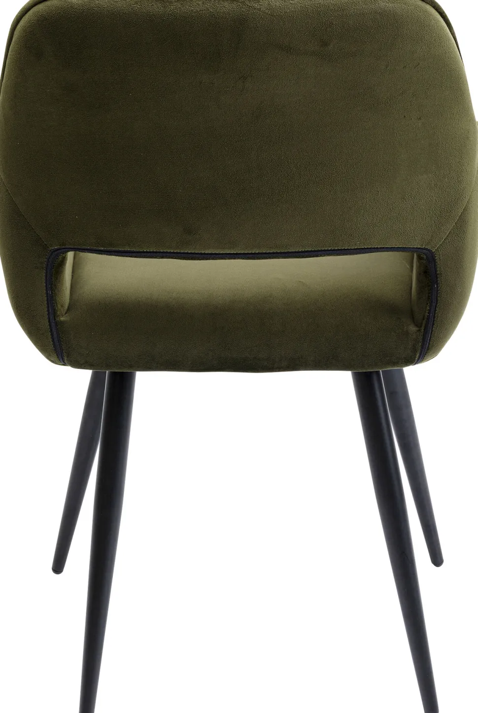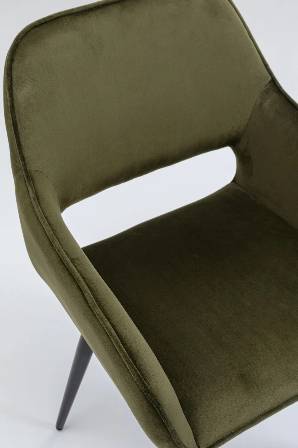 - Grüner Armlehnstuhl in Samtoptik mit eleganter Kedernaht, schnittiger Form und stabilen, schwarzen Beinen aus Stahl