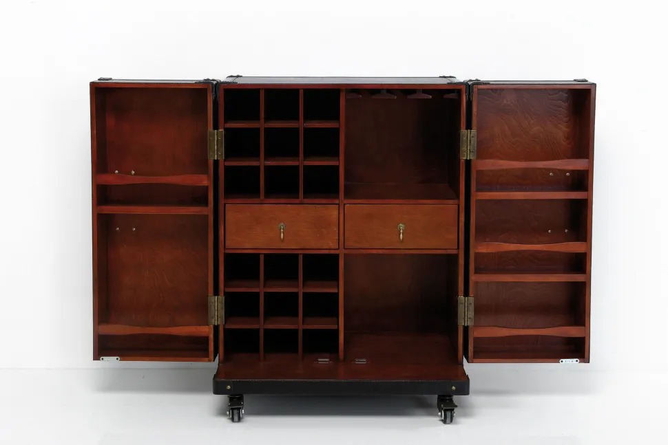 - Geschlossen ein Übersee-Schrankkoffer, offen eine repräsentative Hausbar mit Klappfunktionen