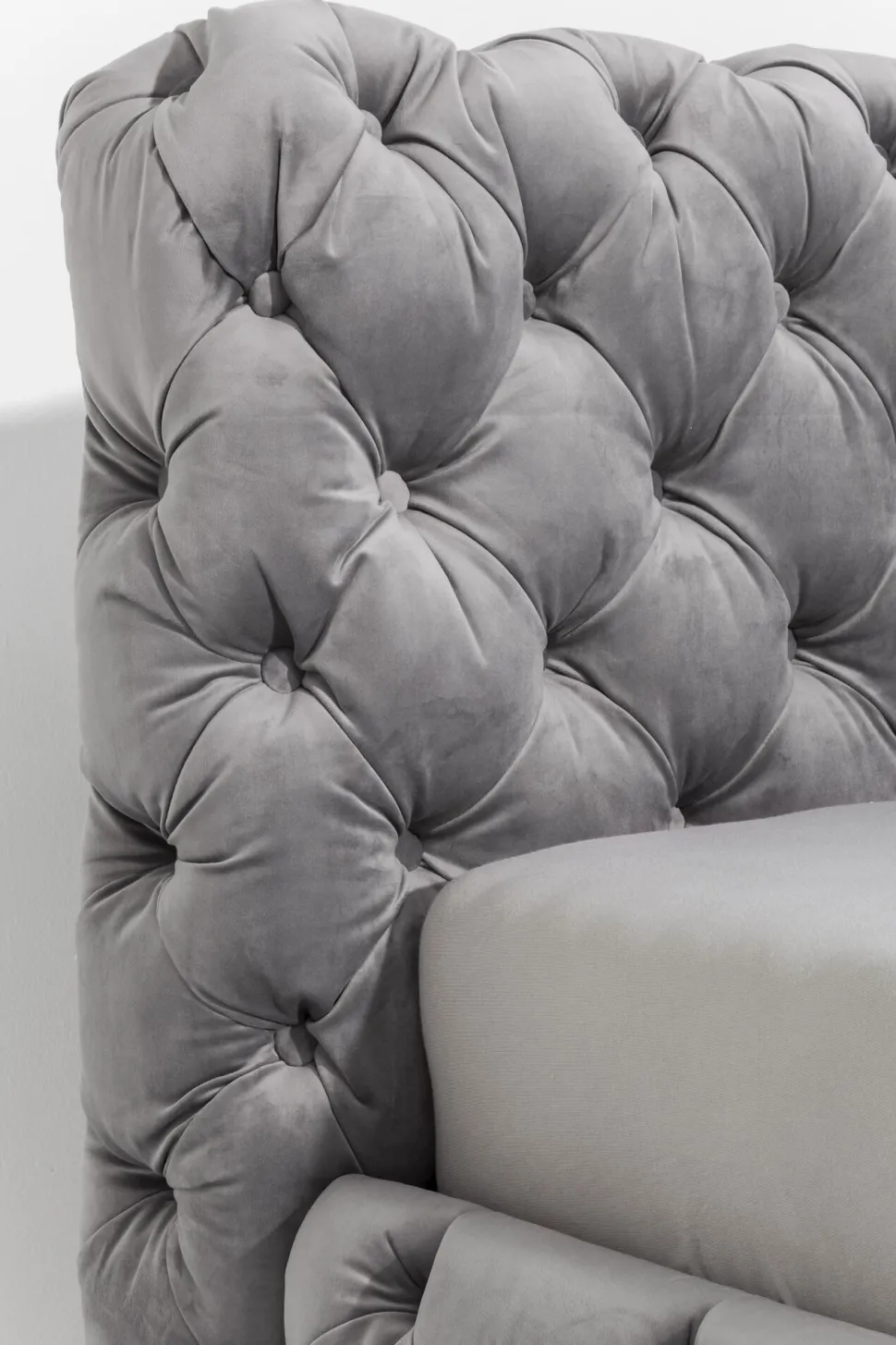 - Luxuriös: silbergraues Polster-Bett mit einem samtigen Bezug in Silbergrau, aufwändiger Knopfheftung und neo-barocken Füßen aus massiver Buche