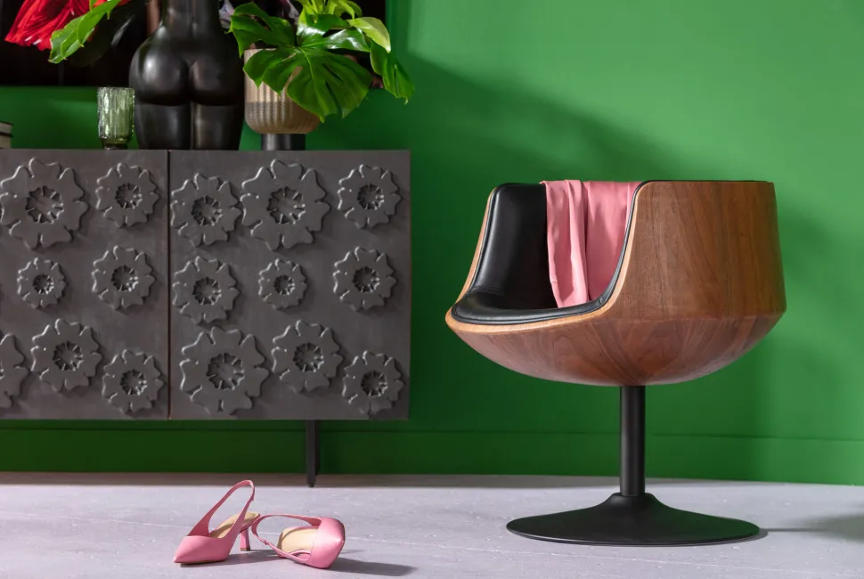 - Club-Drehsessel in schwarzer Lederoptik und mit einer Schale, die außen mit edlem Walnussfurnier versehen ist
