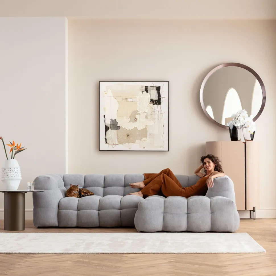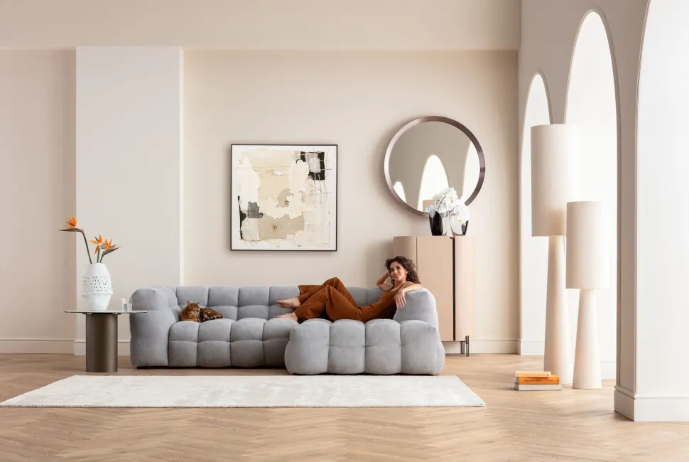 - Weiche Formen in hellen, natürlichen Tönen und ein außergewöhnlicher Materialmix