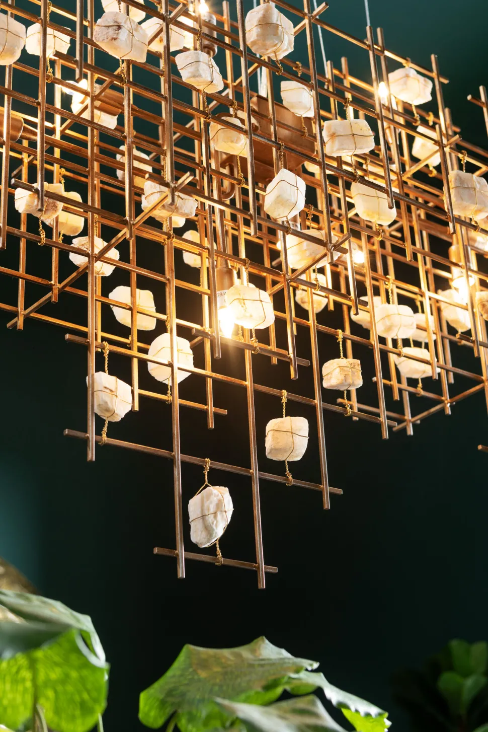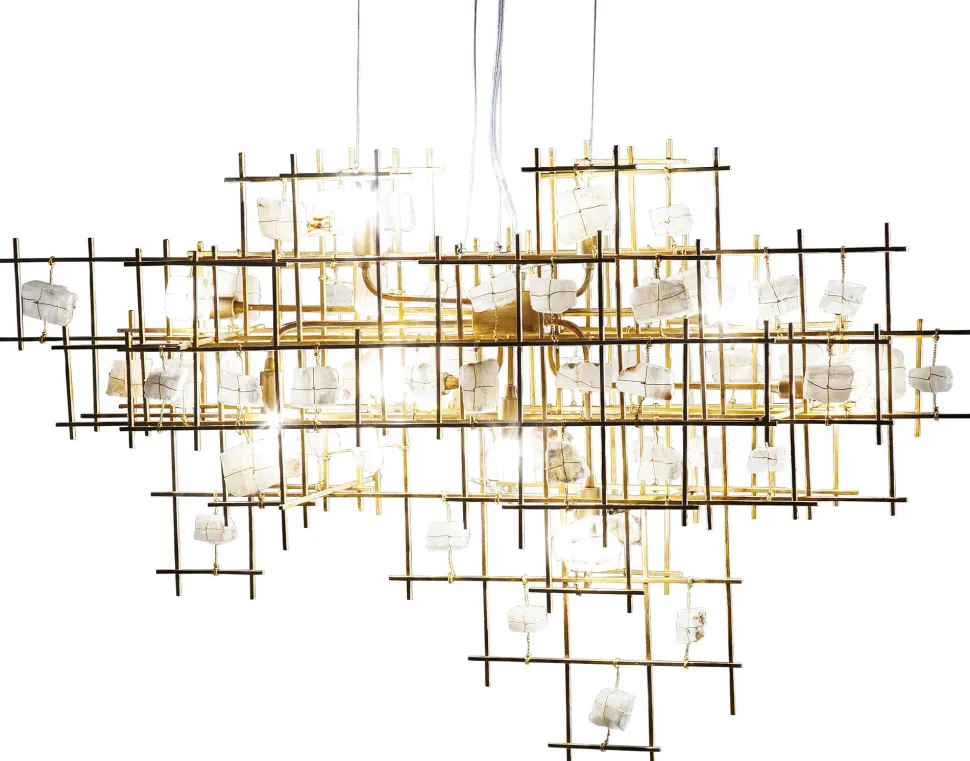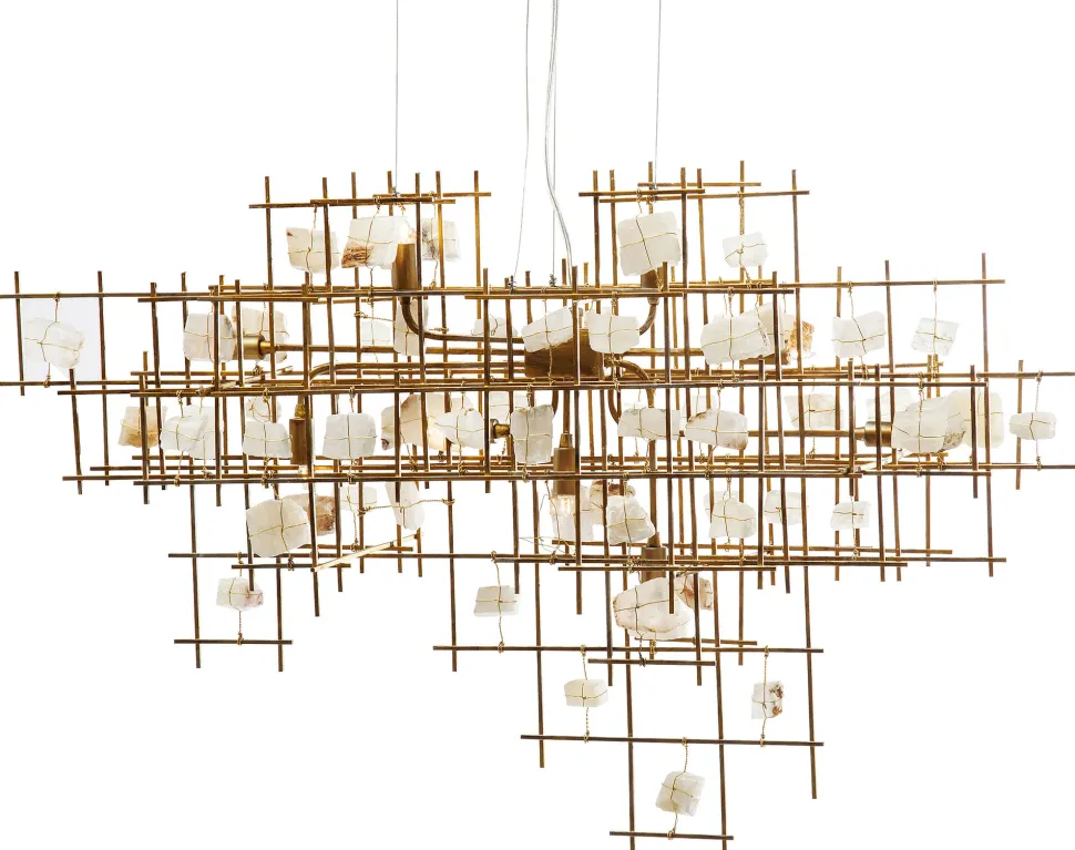 - Einzigartige Hängeleuchte in Gold mit Details aus Kalzit-Steinen, 60 x 100 x 27 Zentimeter (H/B/T)