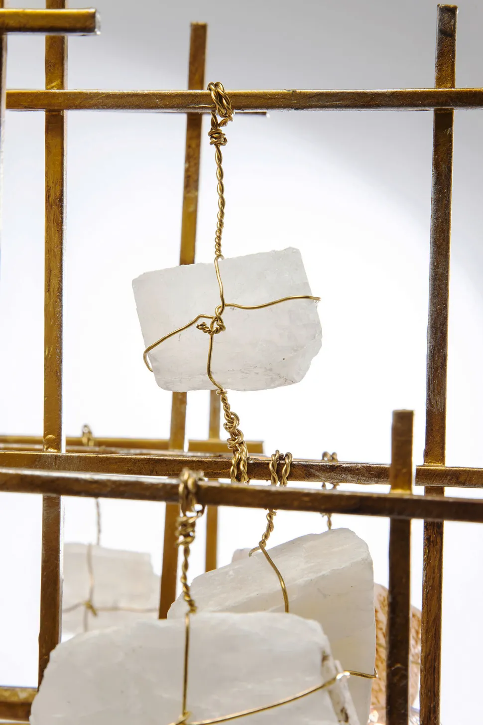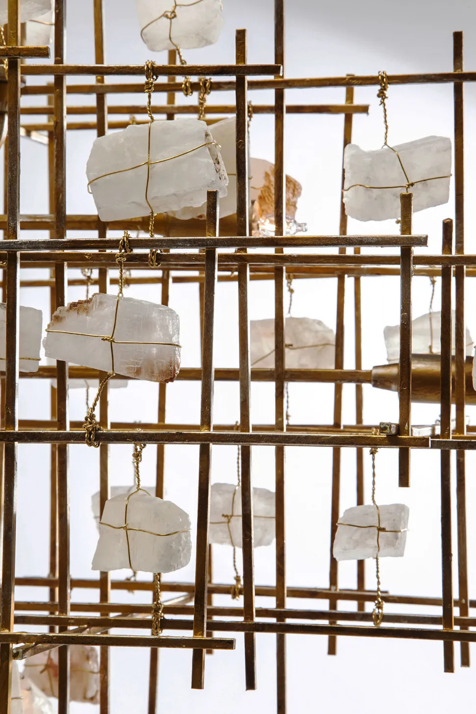 - Natürlich geformte Kalzit-Steine und das Gittergestell aus Stahl erzeugen einzigartige Lichtreflexe