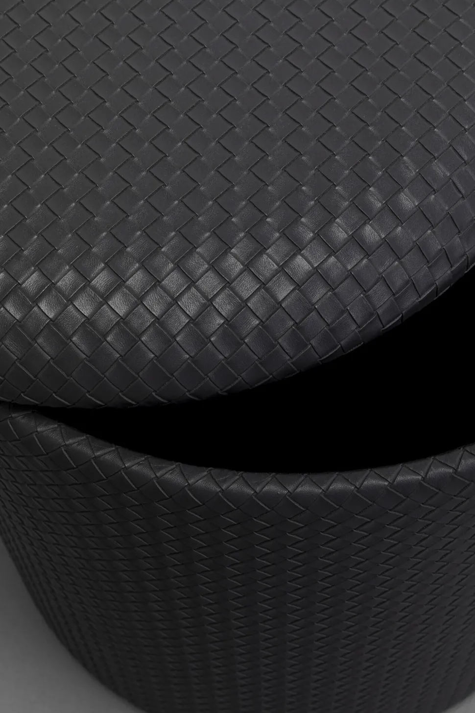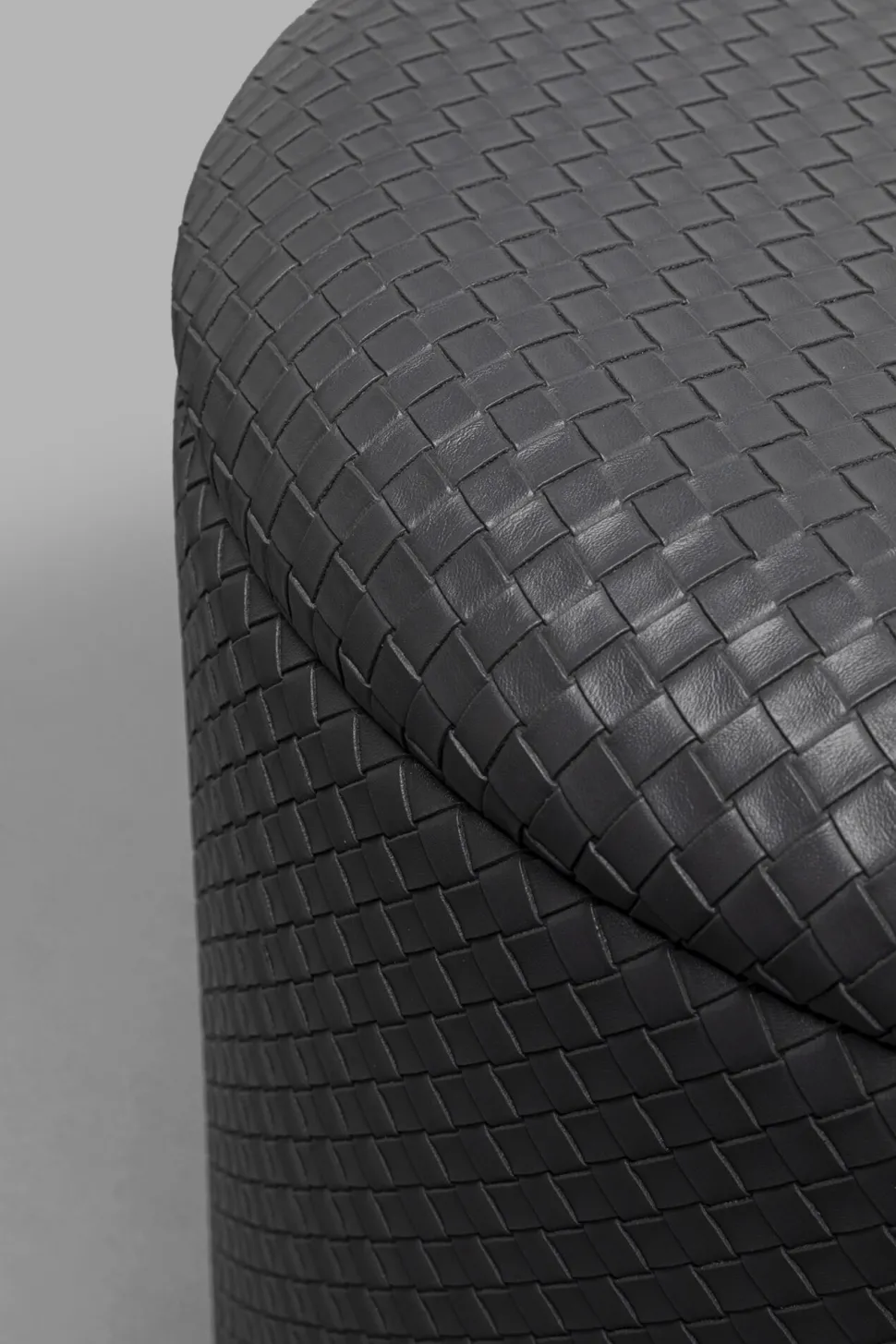 - Der Sitzhocker überzeugt mit seinem schwarzen, geflochtenen Kunstlederbezug und schlichter, abgerundeter Form