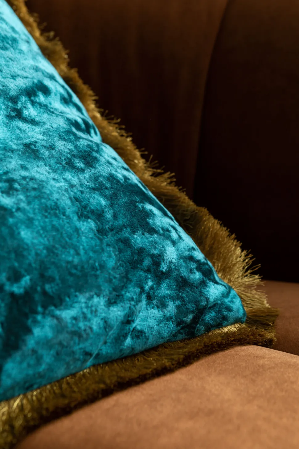 - Eine extravagante Fransenkante ziert das samtweiche Kissen in trendigem Blaugrün