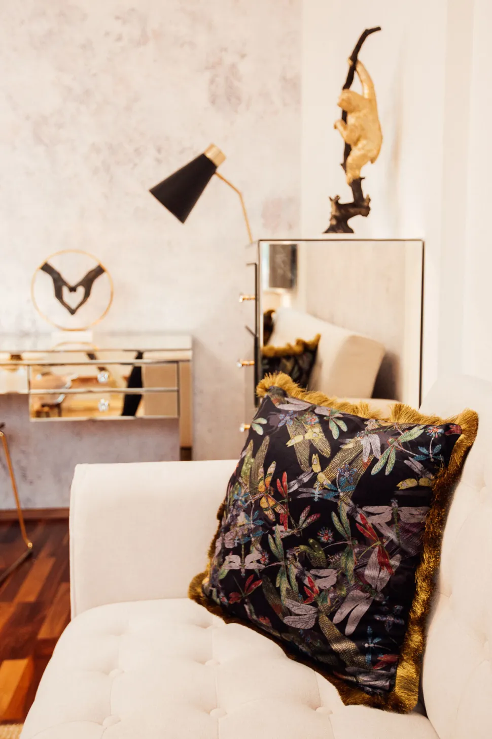 - Glamouröses Upgrade: Zierkissen mit schillernd bunten Libellen auf schwarzem Grund umrahmt von einer Fransenkante in Gold