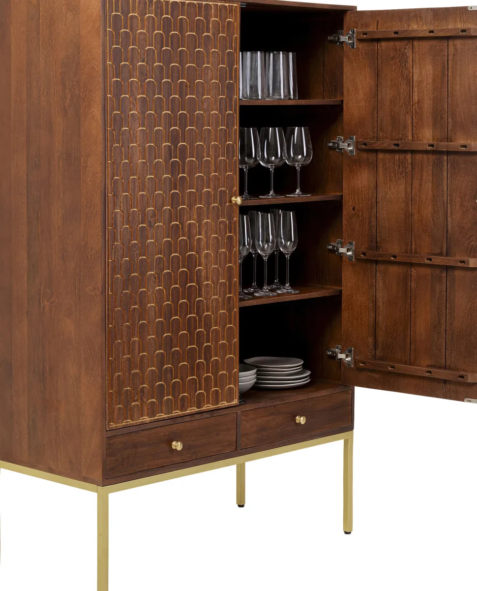 - Mannshoher Schrank aus Mango-Massivholz mit eingravierten, orientalischen Gold-Verzierungen, messingfarbenen Stahl-Beinen und vier Ablageflächen