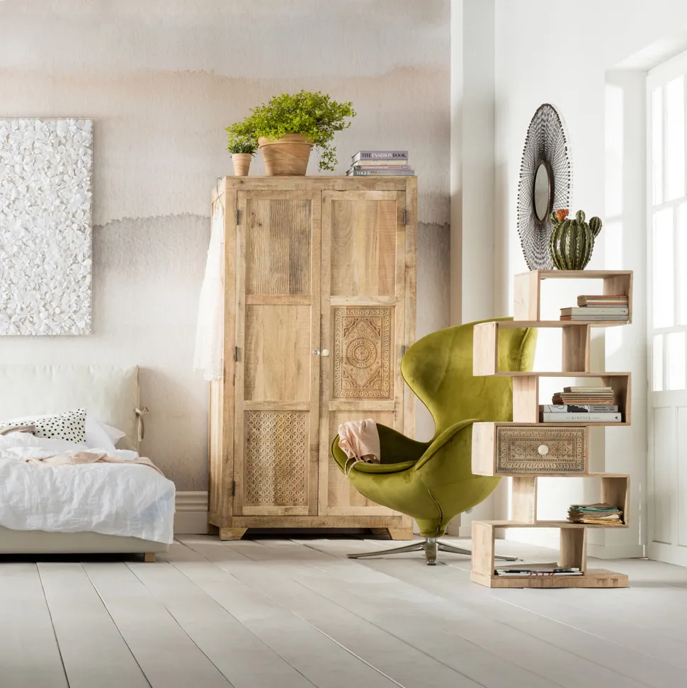 - Hoher Kleiderschrank aus Mango-Massivholz mit dekorativen Schnitzereien, handgefertigt