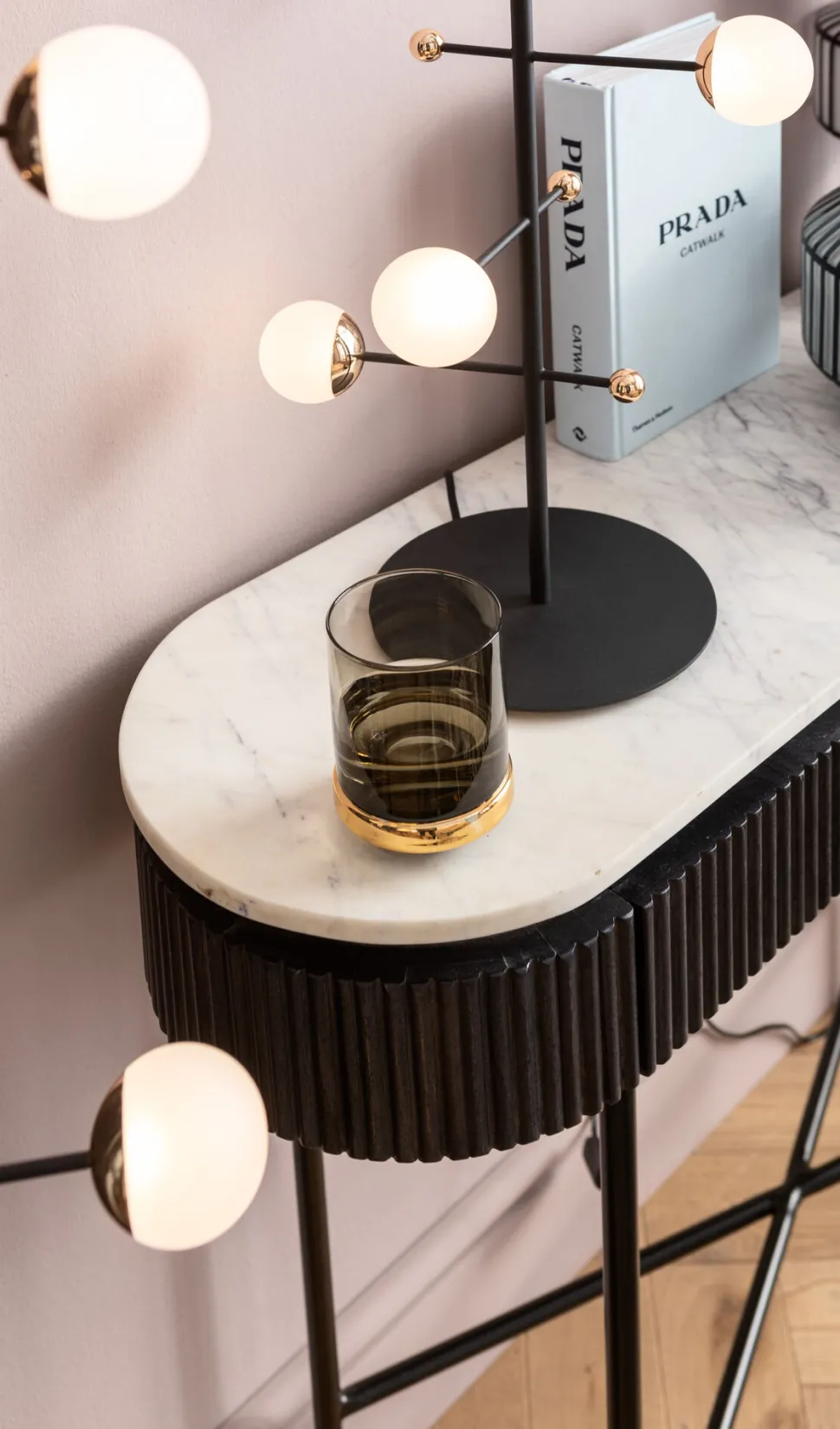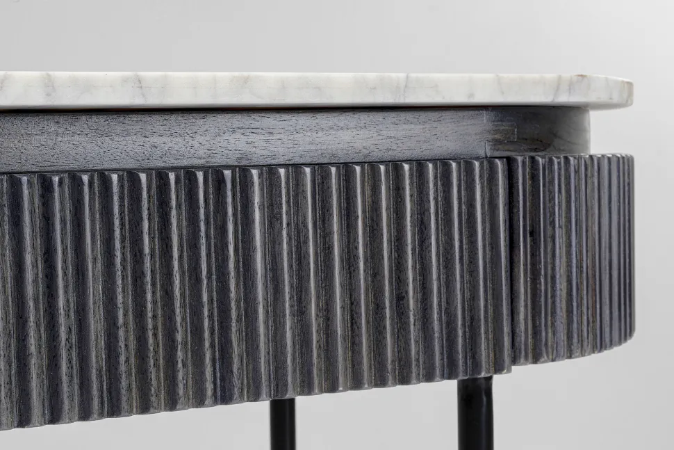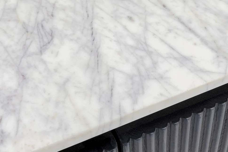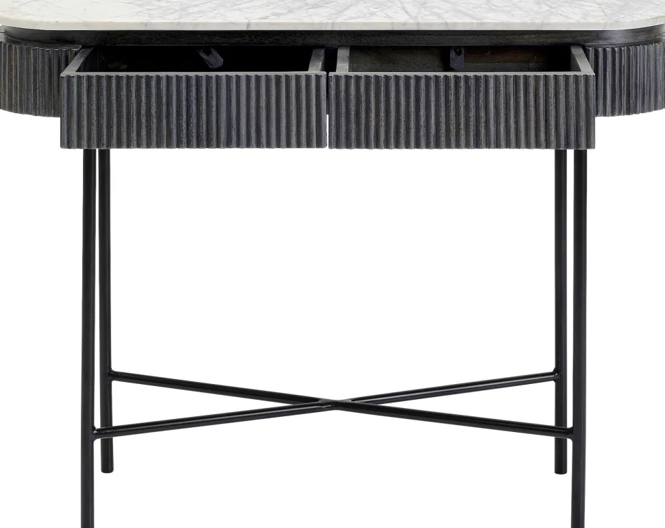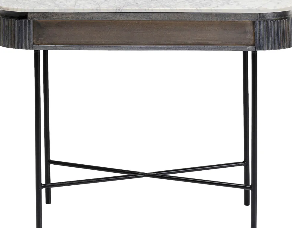 - Spielt mit dem Schwarz-Weiß-Kontrast: elegante Flurkonsole mit heller Marmorplatte und dunkelgrauem Massivholz-Korpus auf filigranem Stahlgestell in Schwarz
