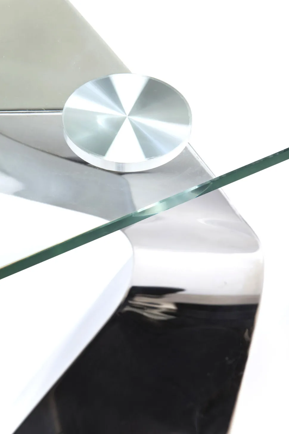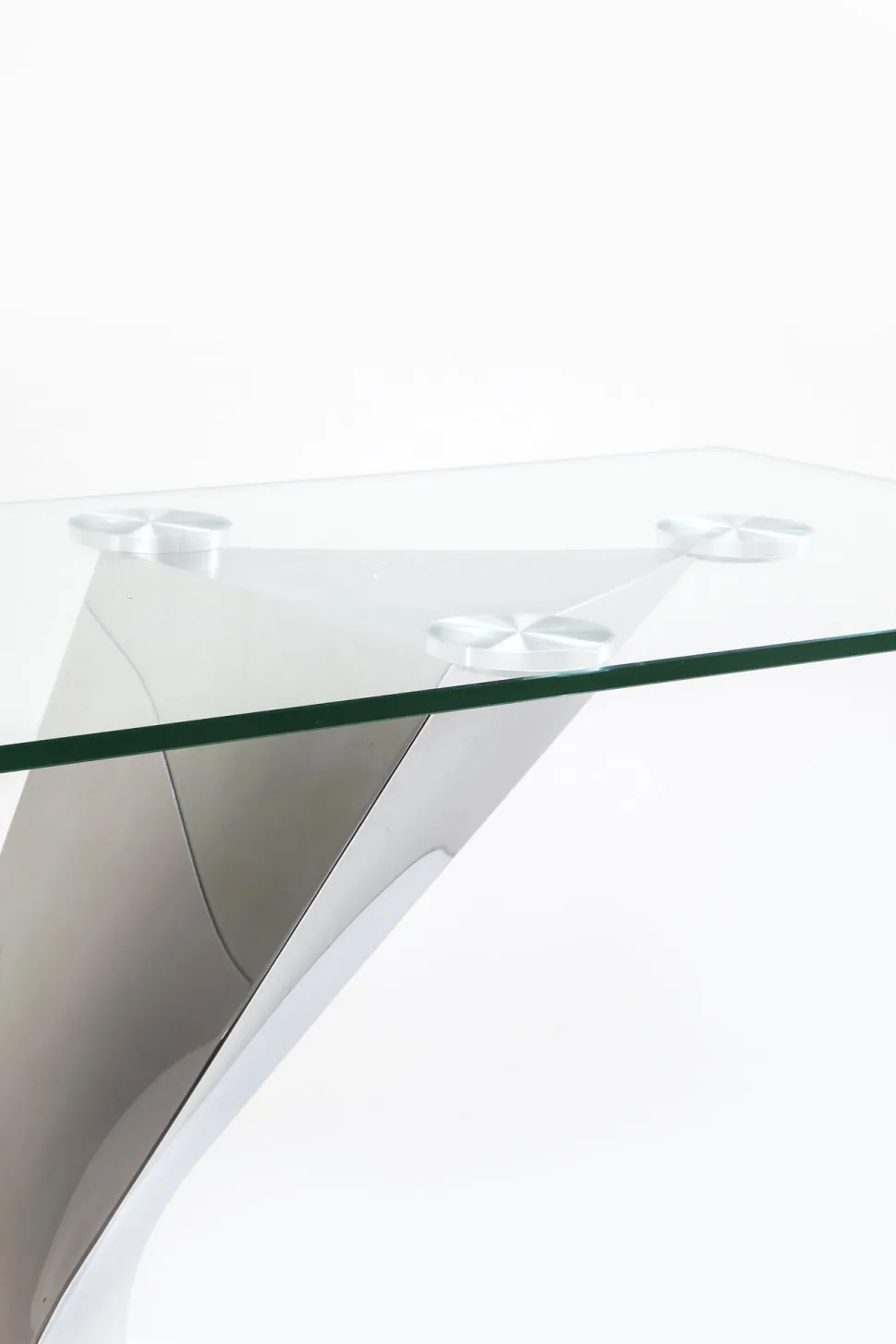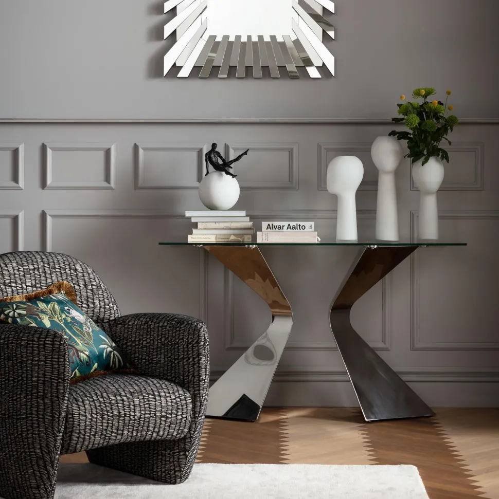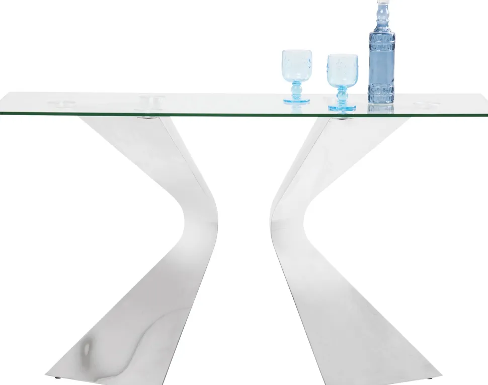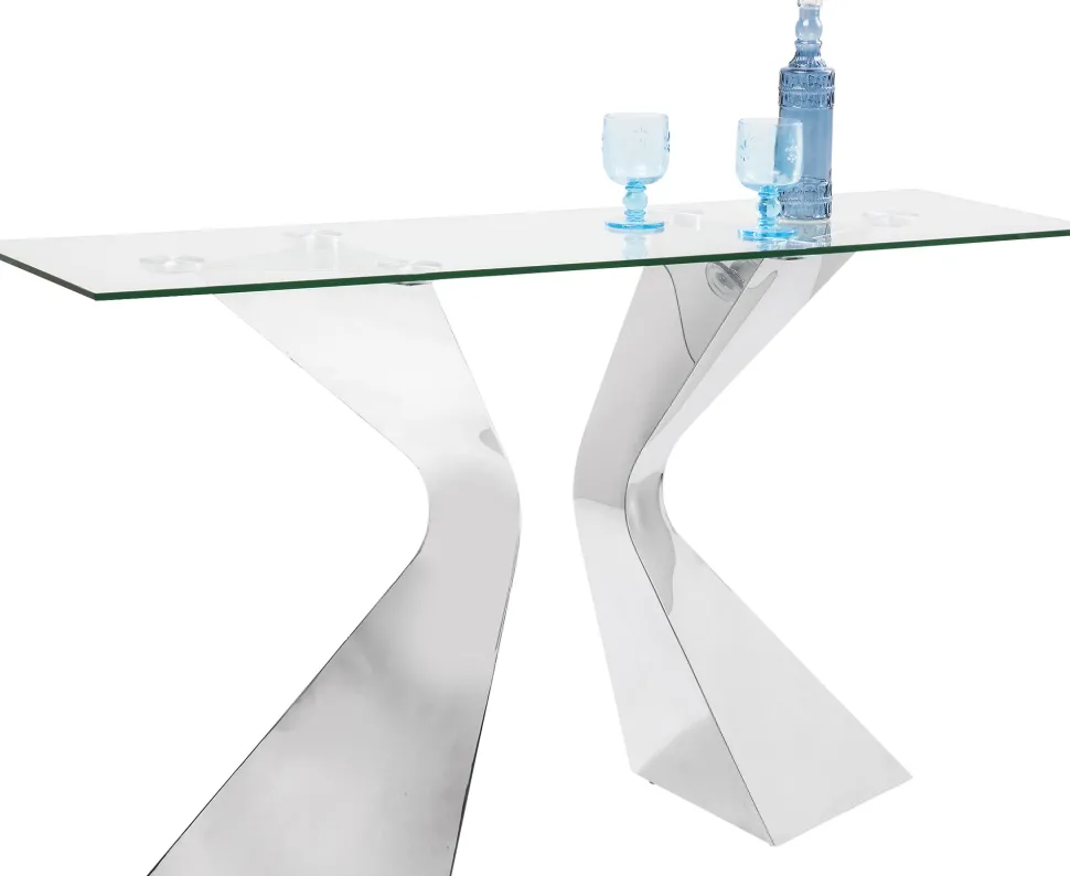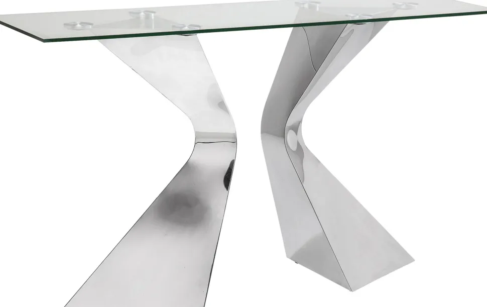 - Luxuriöse, chromglänzende Konsole mit Glasplatte und skulpturalem Gestell aus Edelstahl