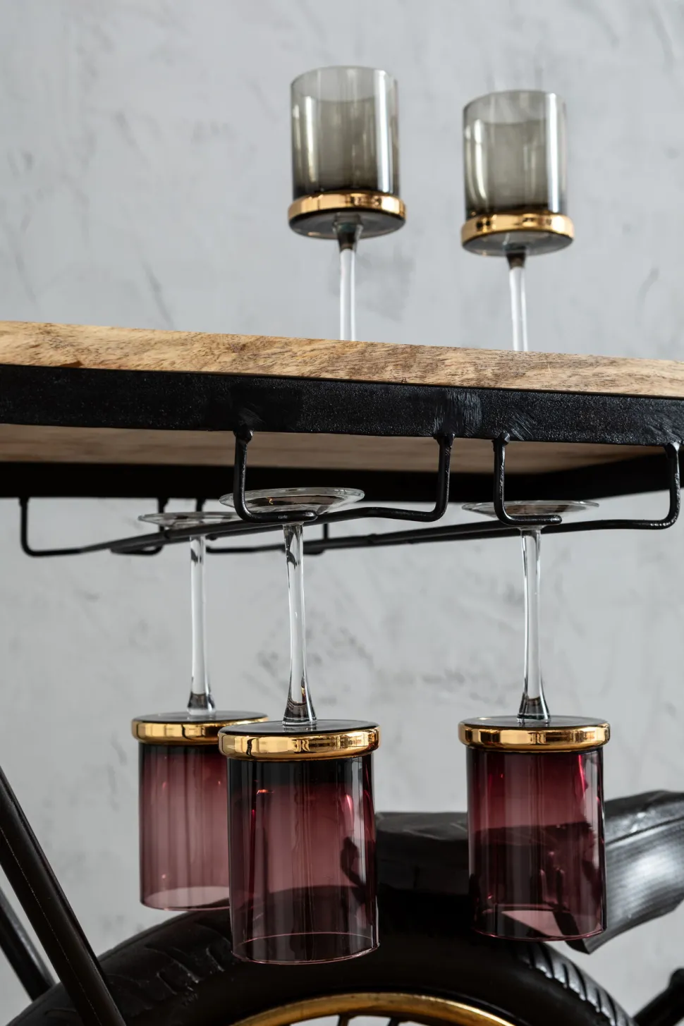- In den Zylindern steckt der gute Stoff: Dort lassen sich vier Flaschen aufbewahren und für Gläser gibt es Halterungen