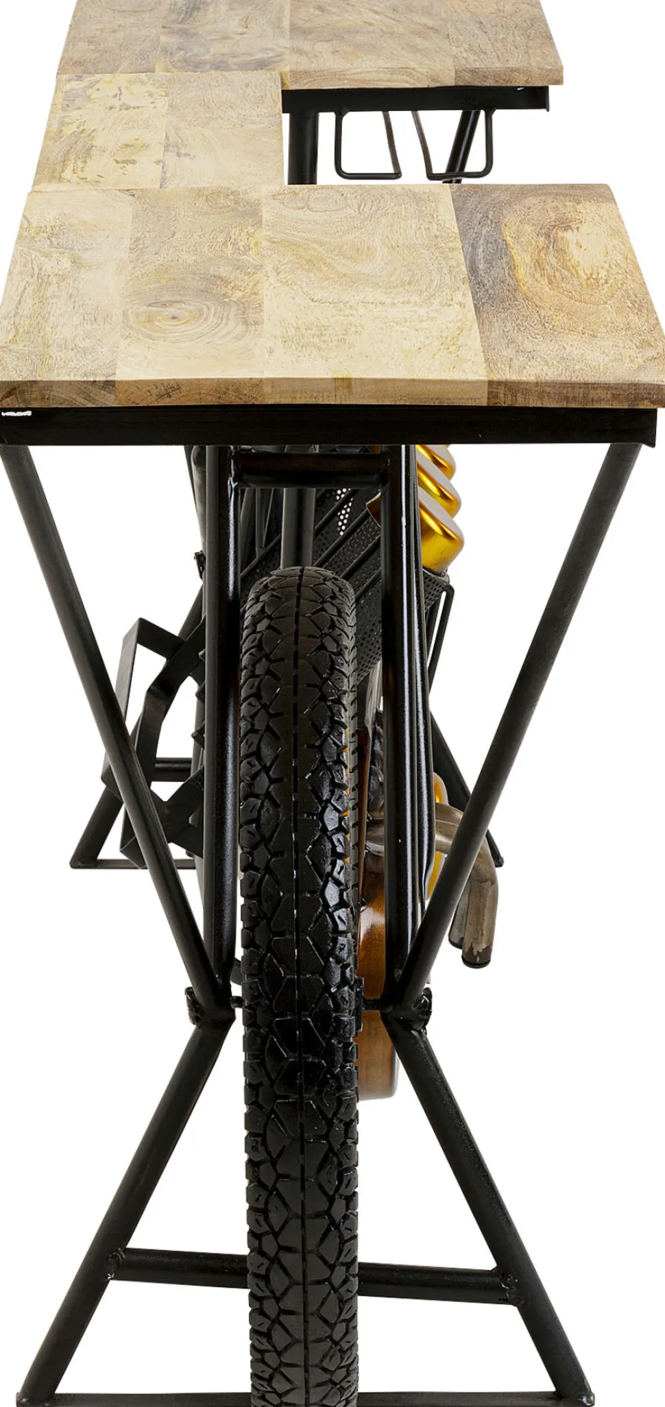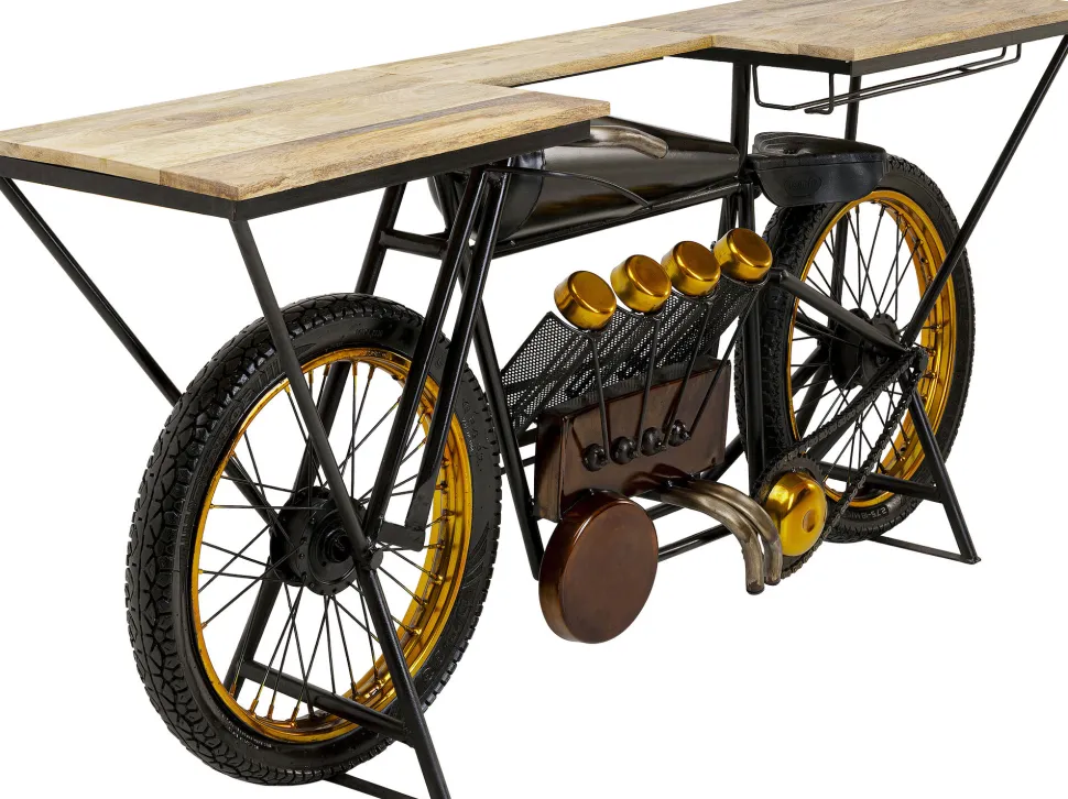 - Breite Konsole in Form eines Motorrads mit Massivholzplatte und schwarzem Stahlrahmen. In Handarbeit gefertigt!