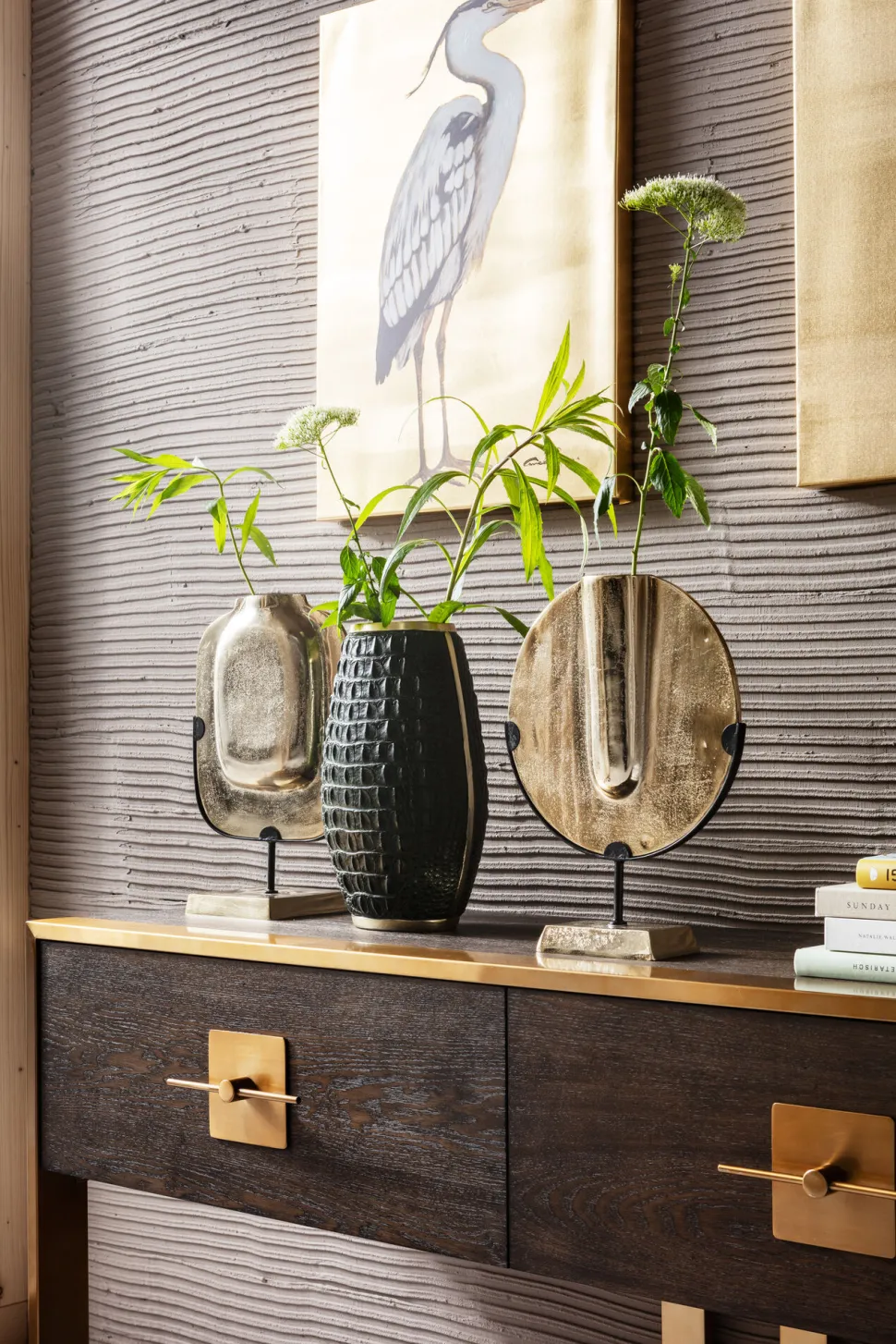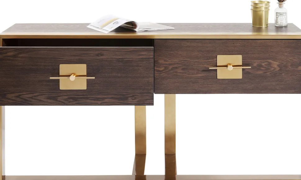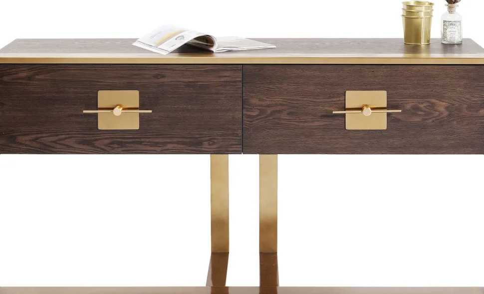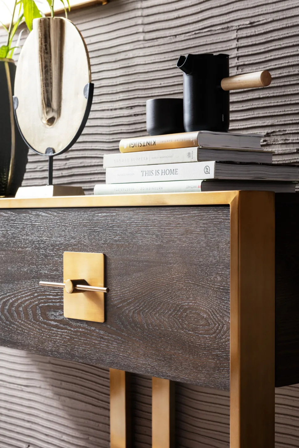 - Besonders schön ist der Mix aus dunkler Esche und glänzendem Messing
