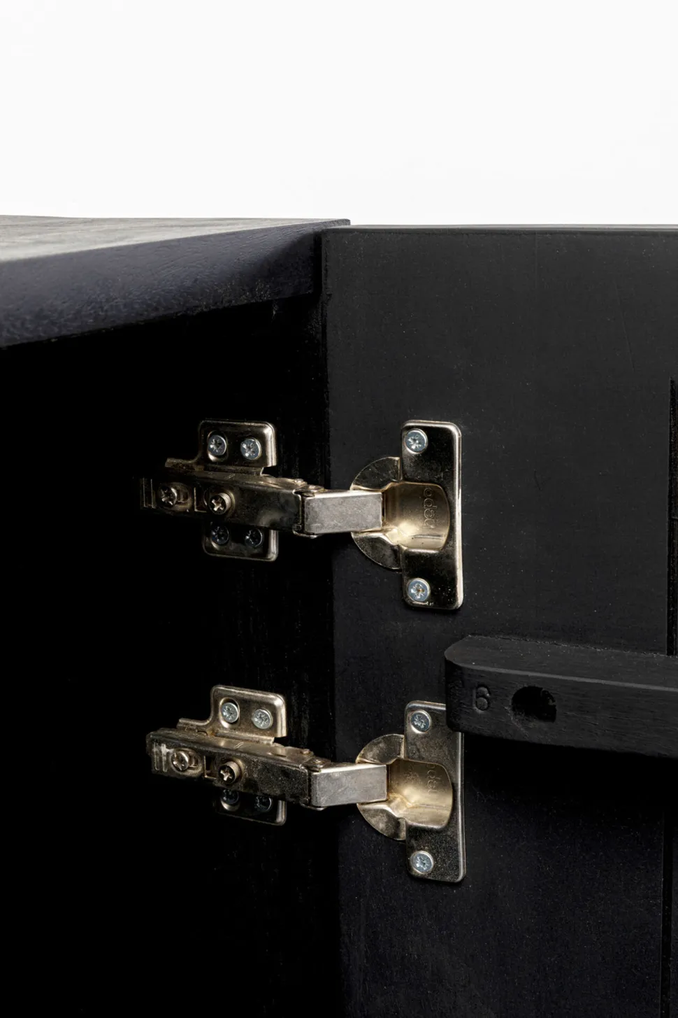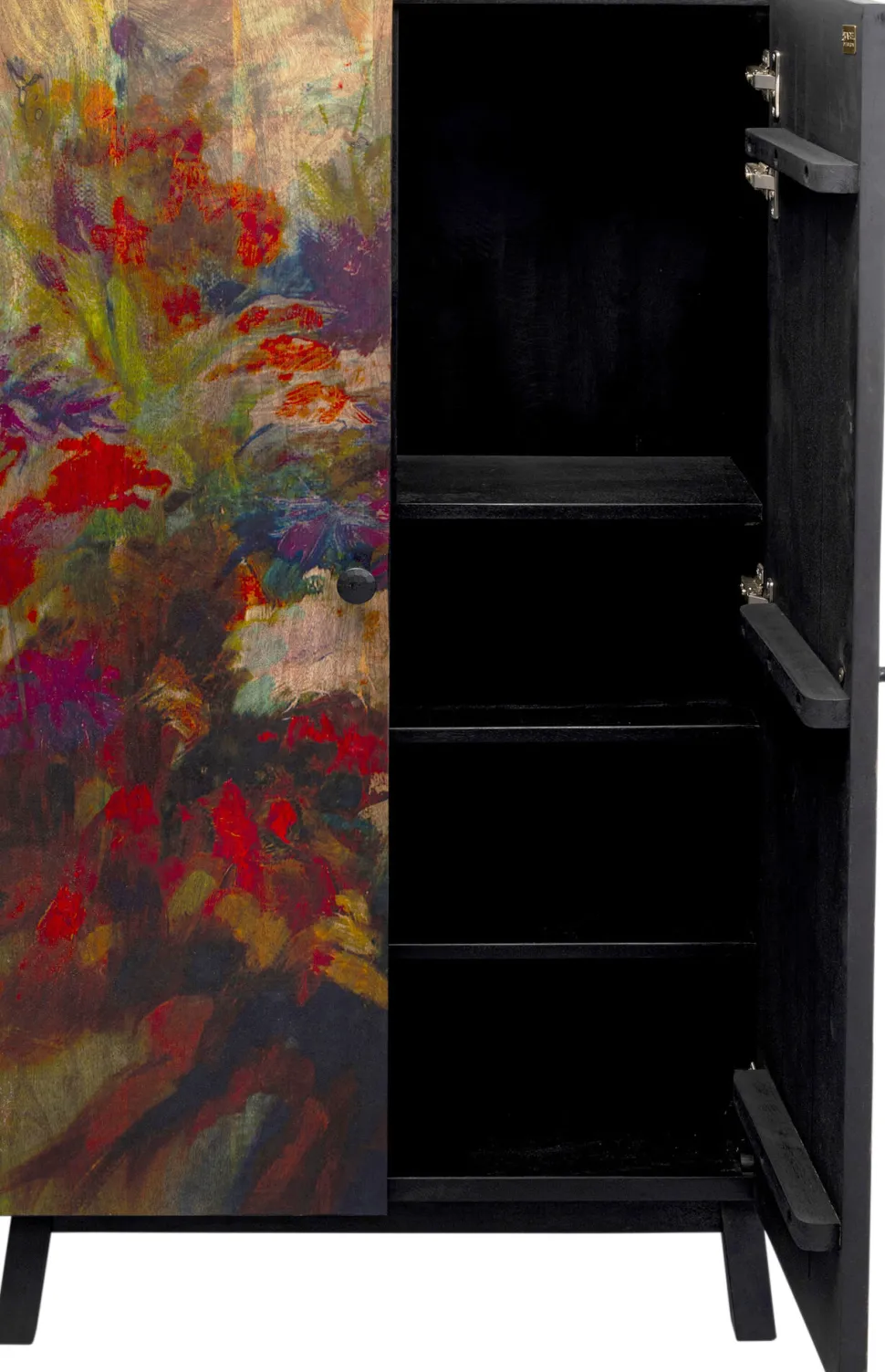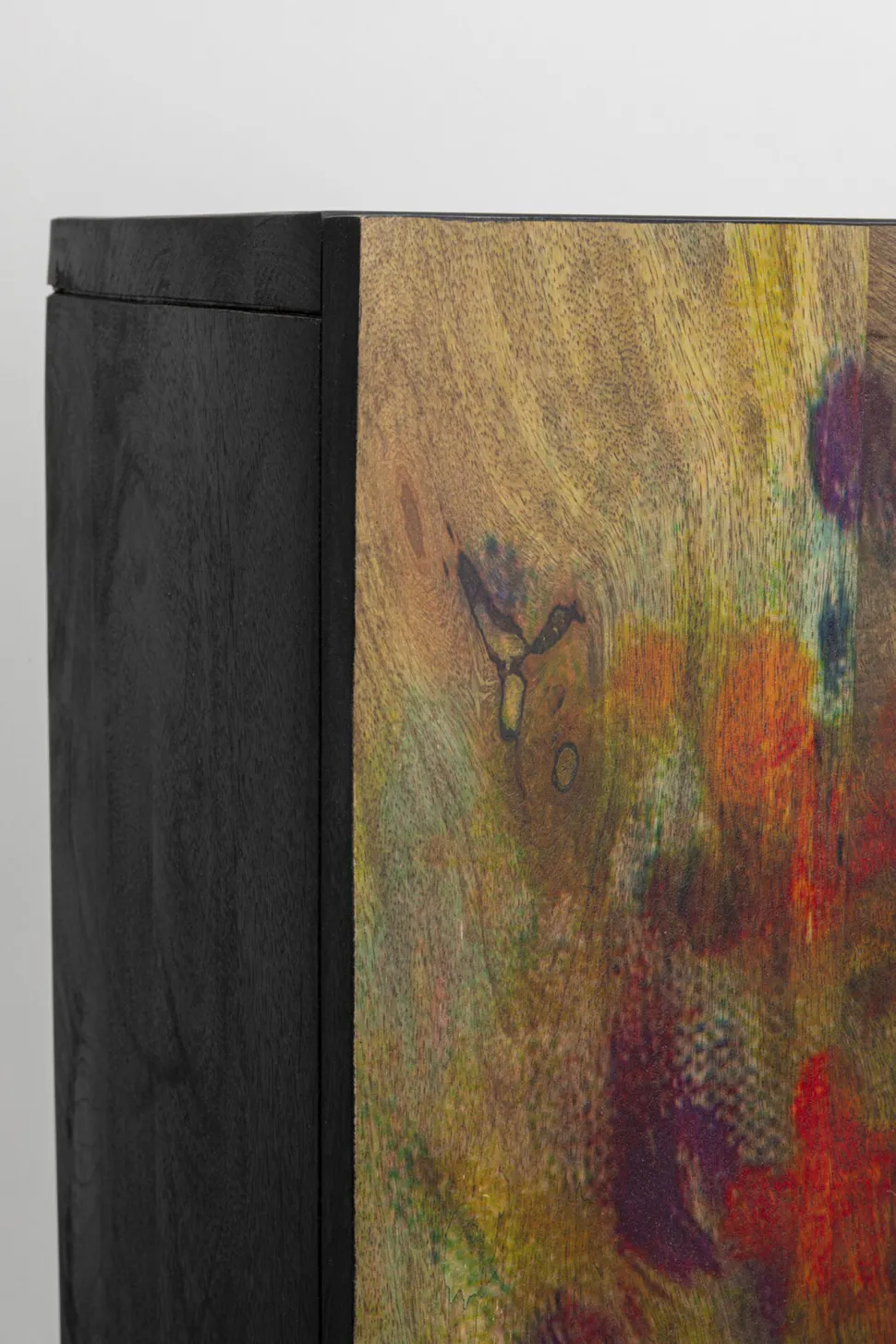 - Rechteckiger, kleiner Schrank mit schwarzem Korpus aus Mangoholz und einer Front mit Pflanzen- und Blumenmotiven