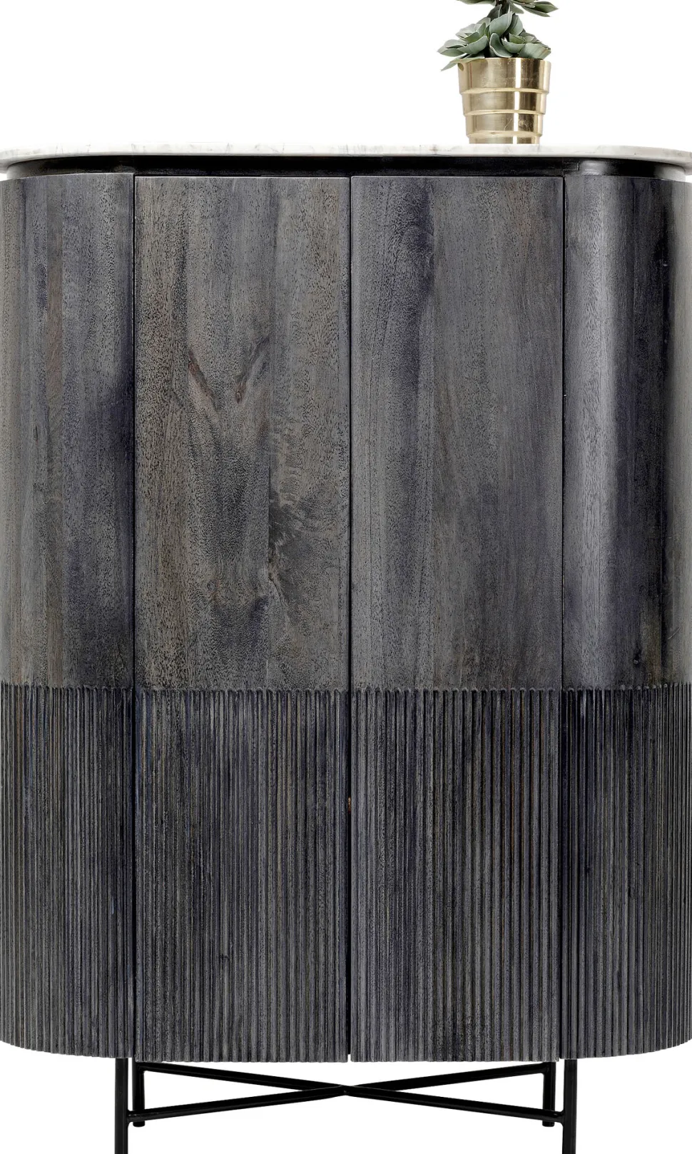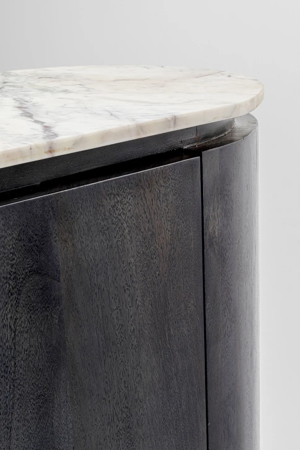 - Spielt mit dem Schwarz-Weiß-Kontrast: eleganter Schrank mit heller Marmorplatte, dunkelgrauem Massivholz-Korpus auf filigranem Stahlgestell in Schwarz
