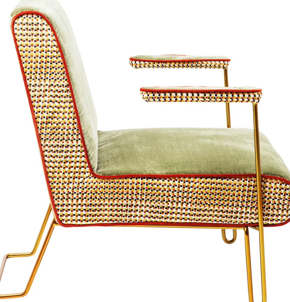 - Grüner Samt-Sessel im 50ies-Look mit dekorativen, farbigen Seiten-Details, filigranen Armstützen und Beinen aus Stahl in der Farbe Messing