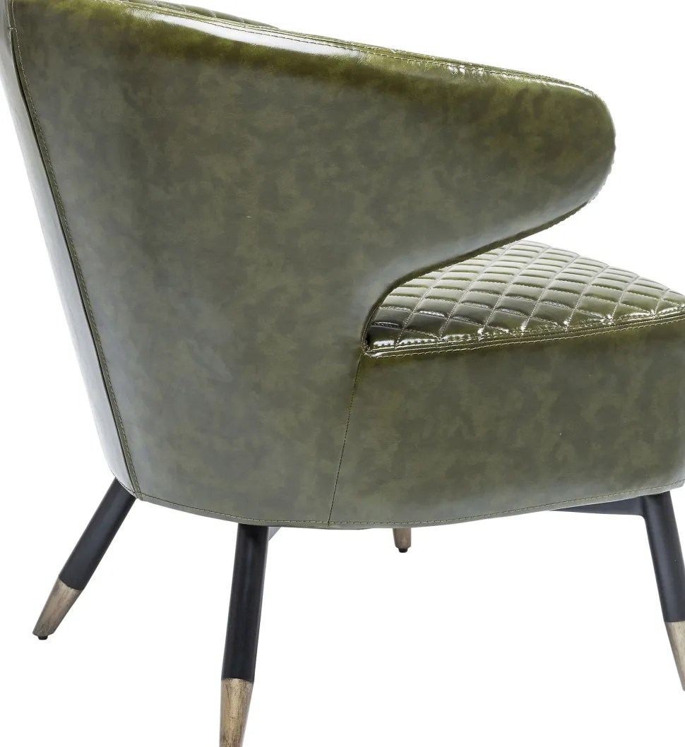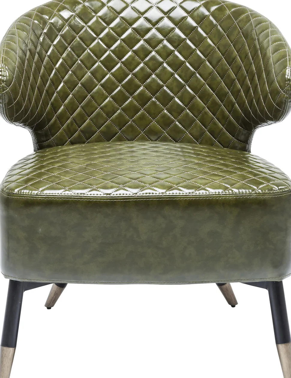 - Grüner Cocktailsessel in edler Vintage-Leder-Optik mit markanter Rautensteppung auf Sitz und Rückenlehne und schwarzen Stahlbeinen