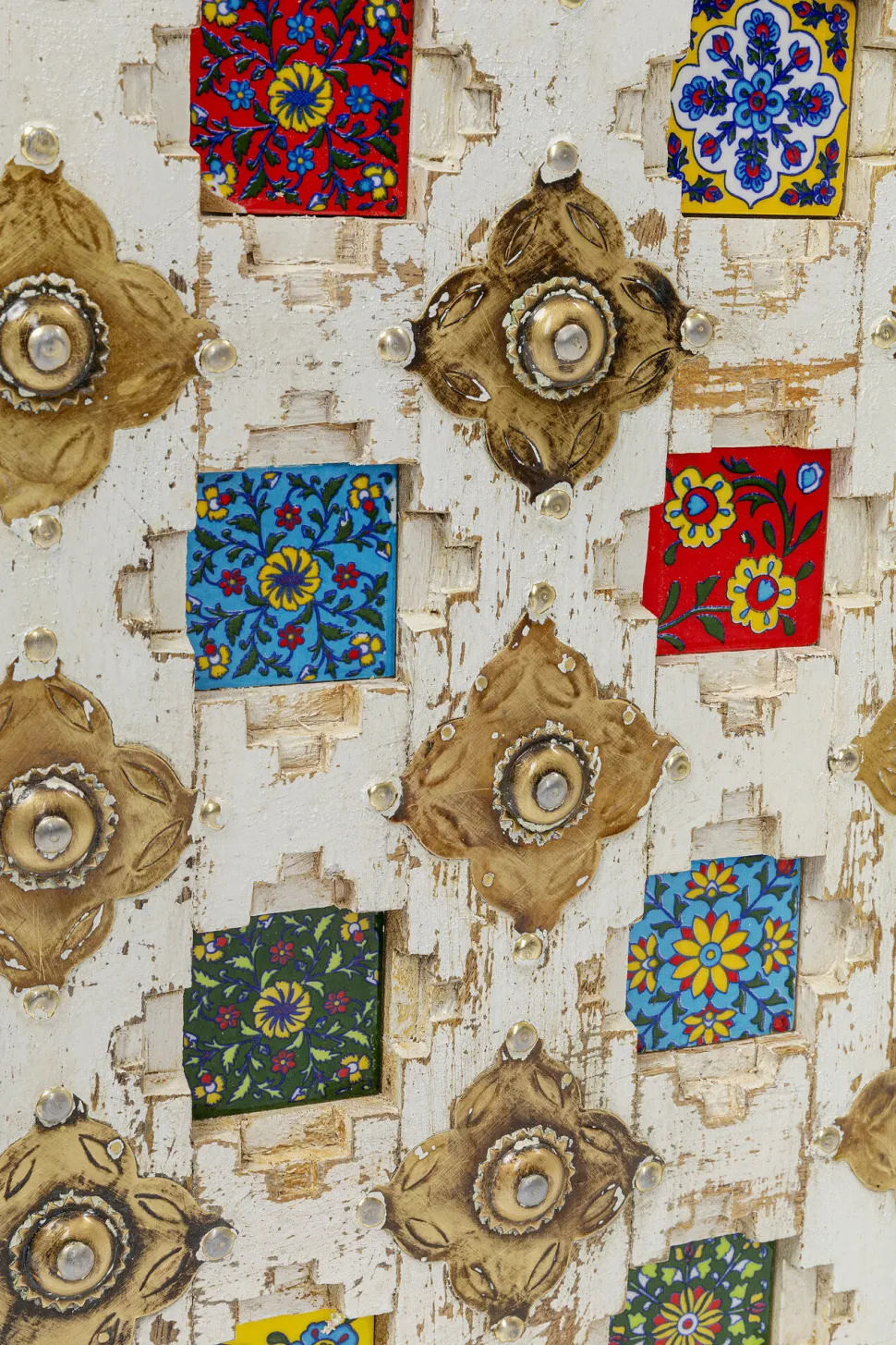 - Massivholz-Sideboard mit aufwändigen Schnitzereien, messingfarbenen Metallverzierungen und bunt gemusterten Kacheln