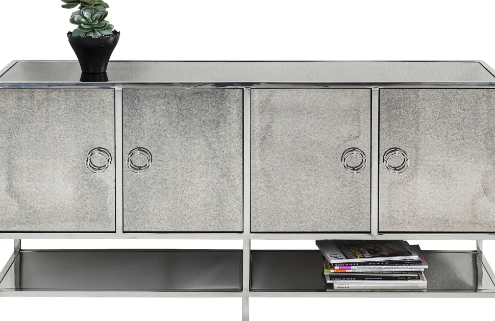 - Sideboard mit grau-melierter Spiegelglas-Verkleidung im Antik Look, Glasboden, silber-glänzendem Stahl-Gestell sowie zwei Böden hinter den vier Türen