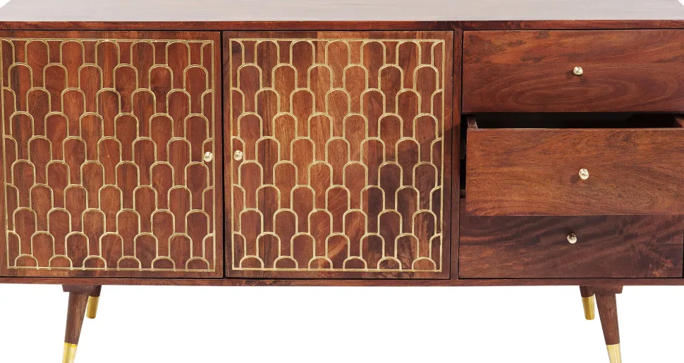 - Handgefertigtes, kompaktes Sideboard aus Mango-Massivholz mit eingravierten, orientalischen Gold-Verzierungen, drei Schüben und zwei Ablageflächen