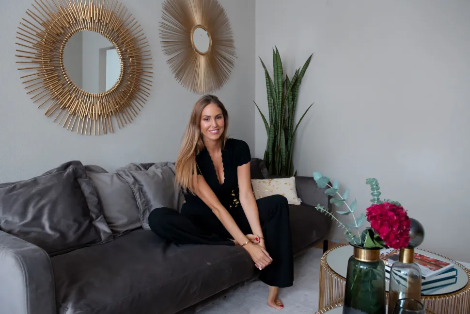 - Ein Zweisitzer-Sofa in Samt aus der Serie Lullaby mit eleganter, moderner Formensprache, abgerundete Armlehnen und zarte Füße sind feine Details