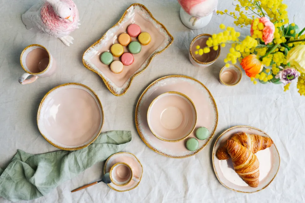 - Der zarte Rosa-Ton und sanfte Details in Weiß und warmem Beige schaffen einen harmonischen, mediterranen Look