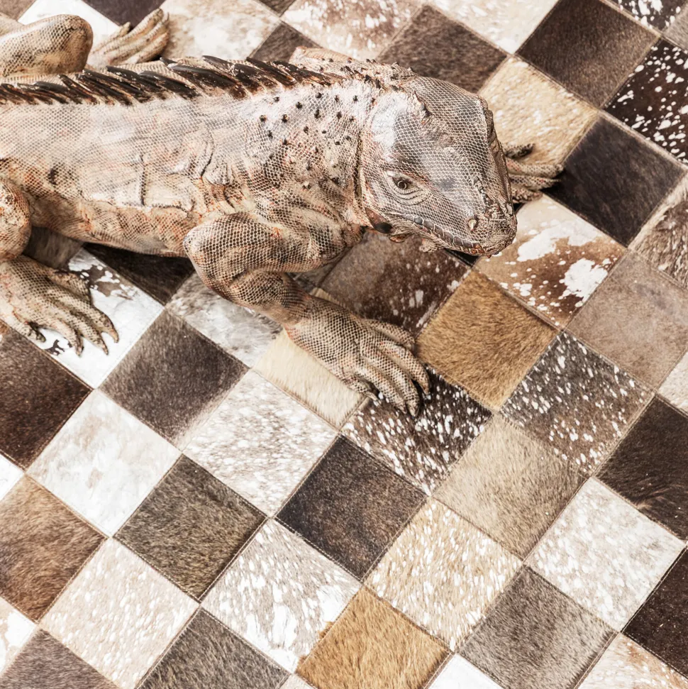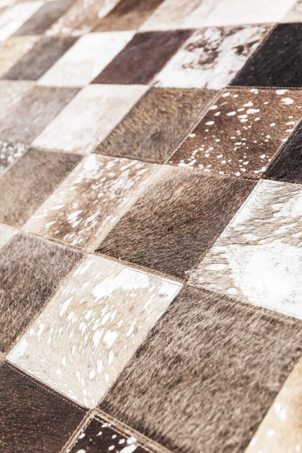 - Teppich im Patchwork-Stil, bei dem verschiedene Fell-Quadrate zu einem Muster zusammengenäht werden