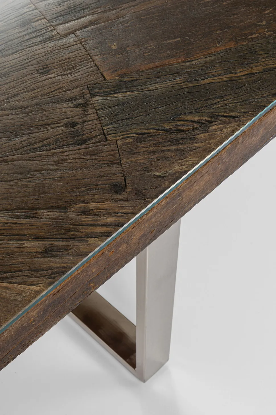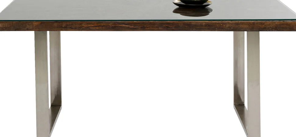- Rechteckiger, dunkler Esstisch aus recyceltem Mango- und Akazienholz mit Glasplatte und verchromten Kufen