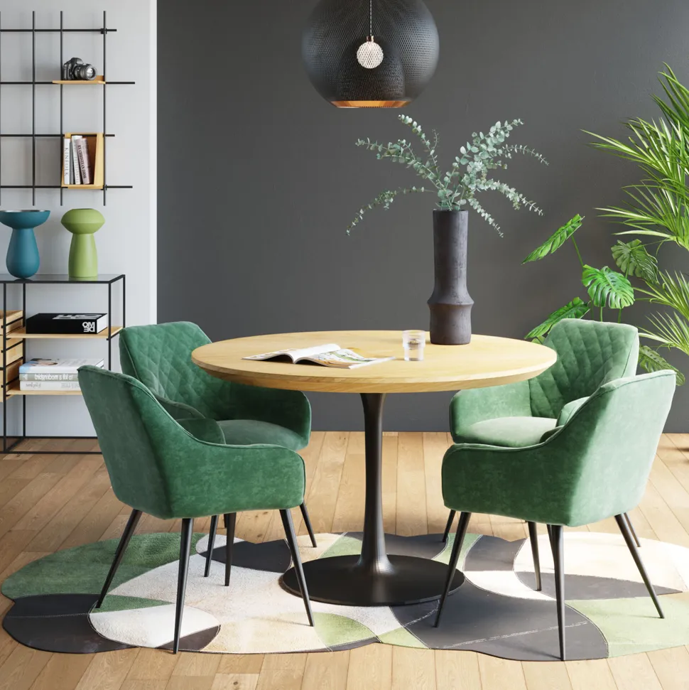 - Runde Tische sind eine großartige Lösung für kleinere Essbereiche, weil sie Platz sparen und leicht wirken – und die Harmonie fördern!