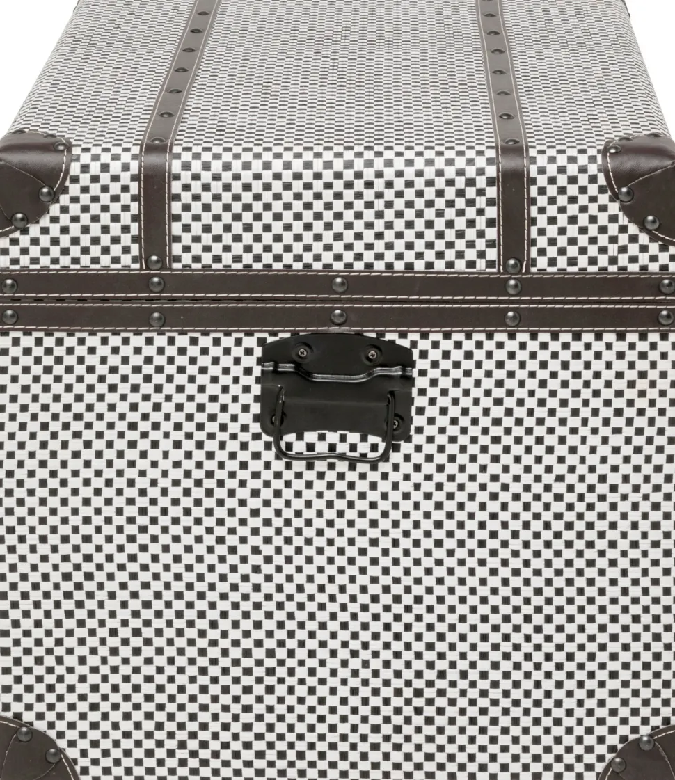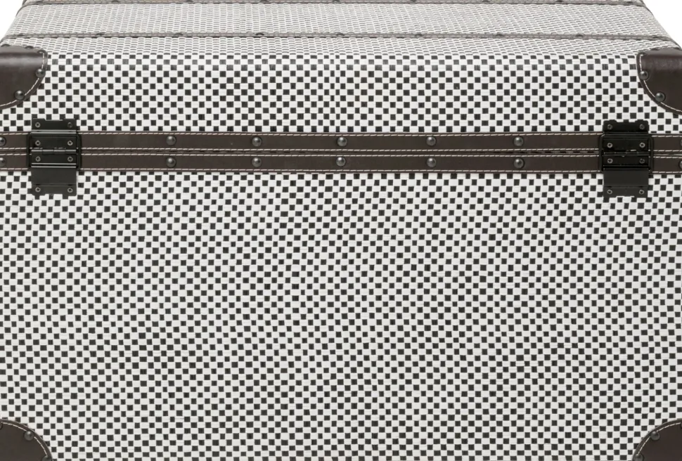 - Aus Holz gefertigt und mit beschichtetem Textilbezug in schwarz-weißem Muster sind die Truhen so funktional wie stylisch