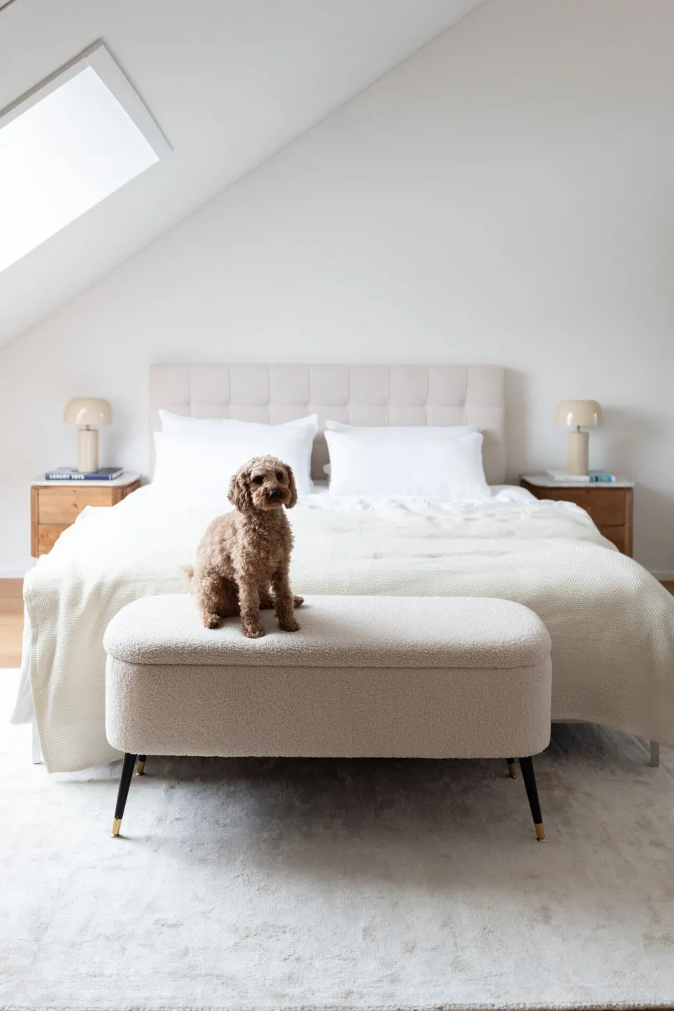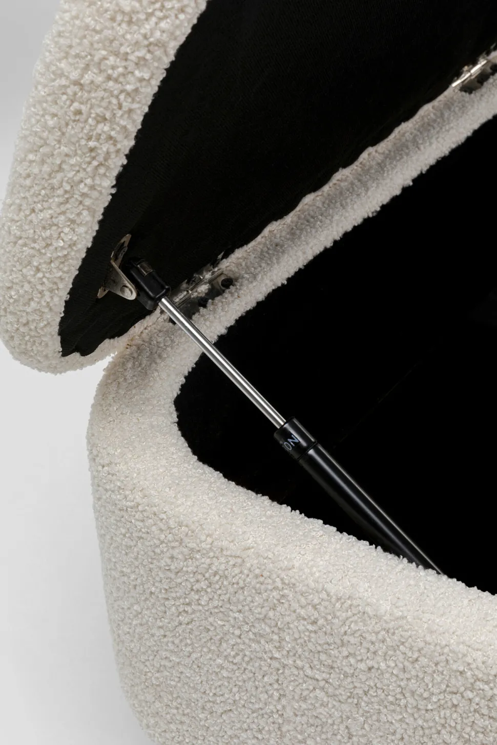 - Der weiche Bouclé-Bezug in zartem Weiß schafft einen harmonischen, eleganten Look