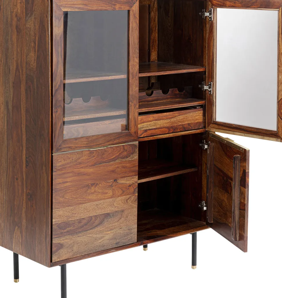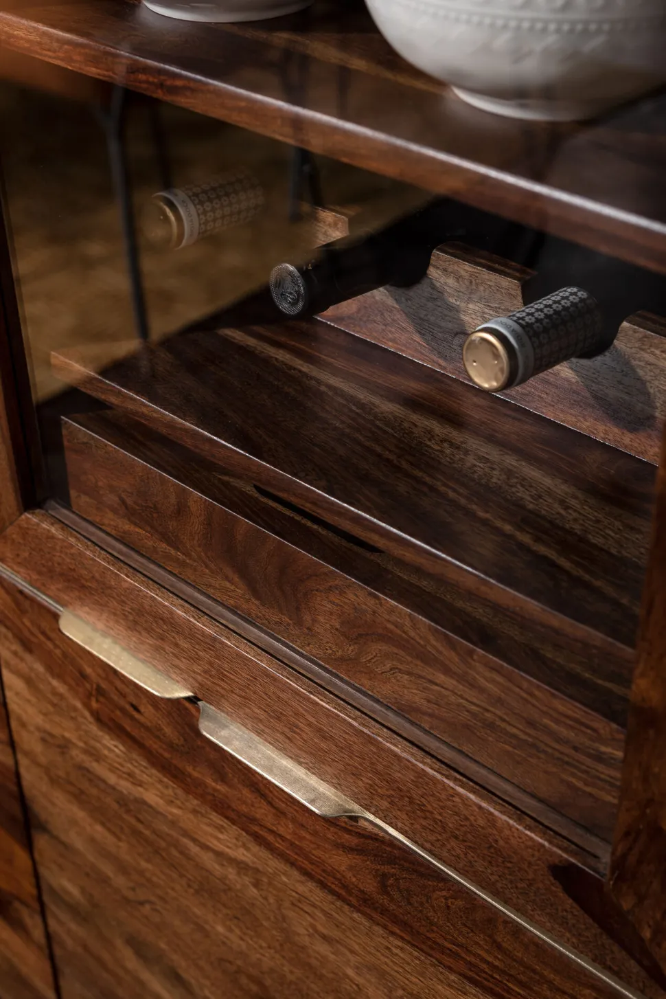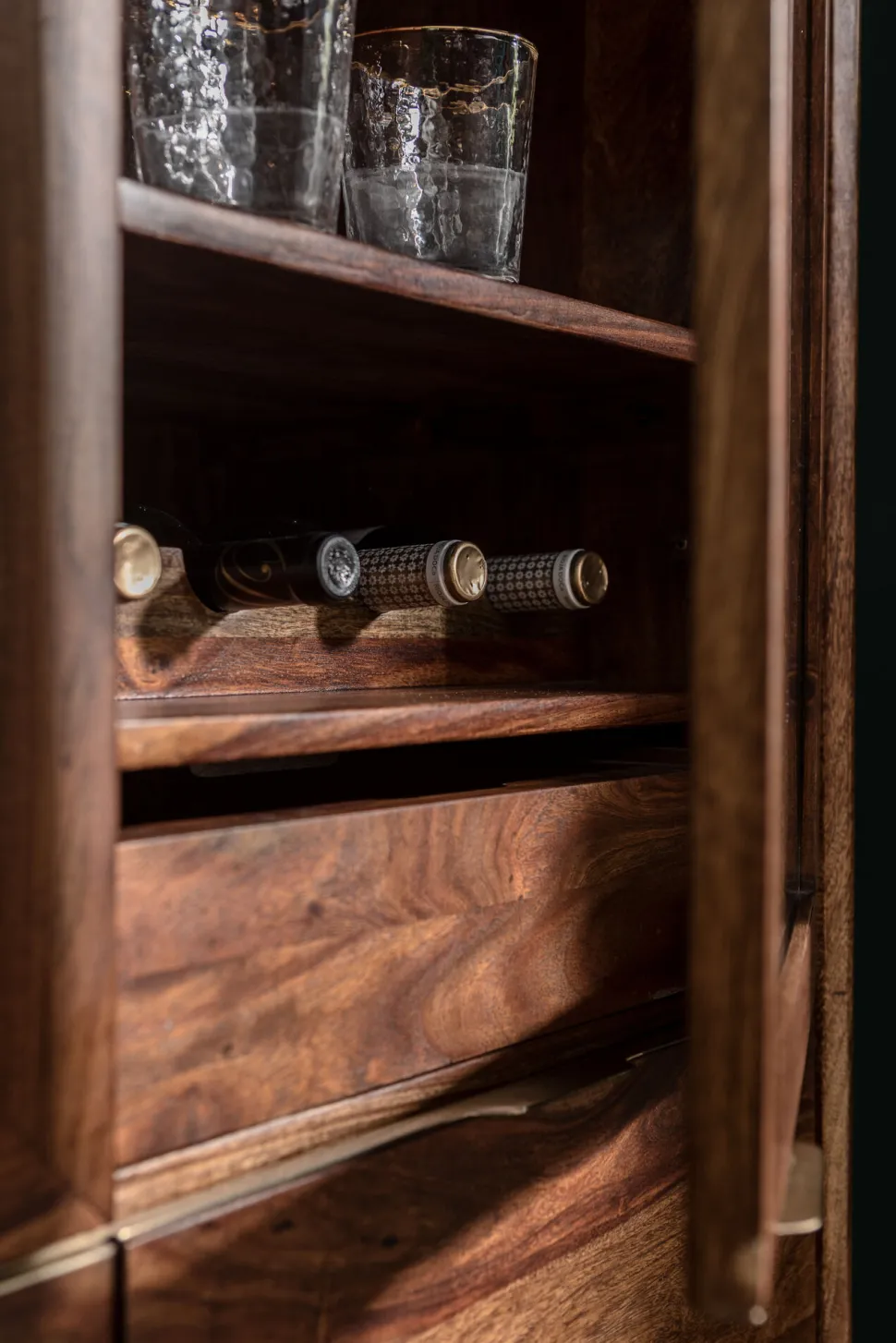- Funktional: Flaschenhalter und Schübe hinter den Glastüren, vier Ablagefächer hinter den Holztüren