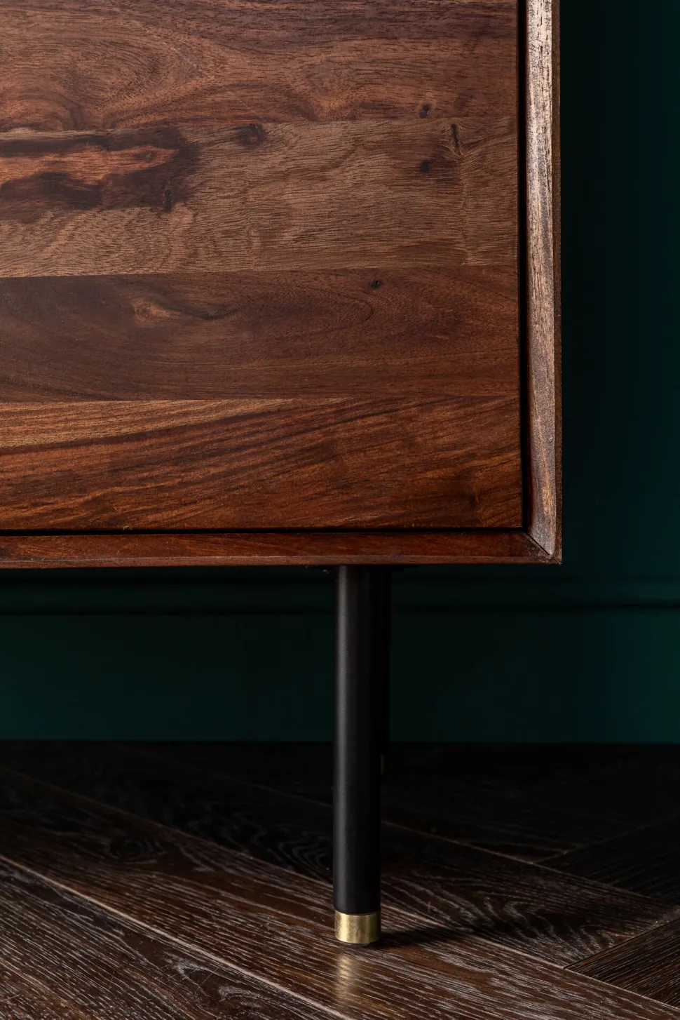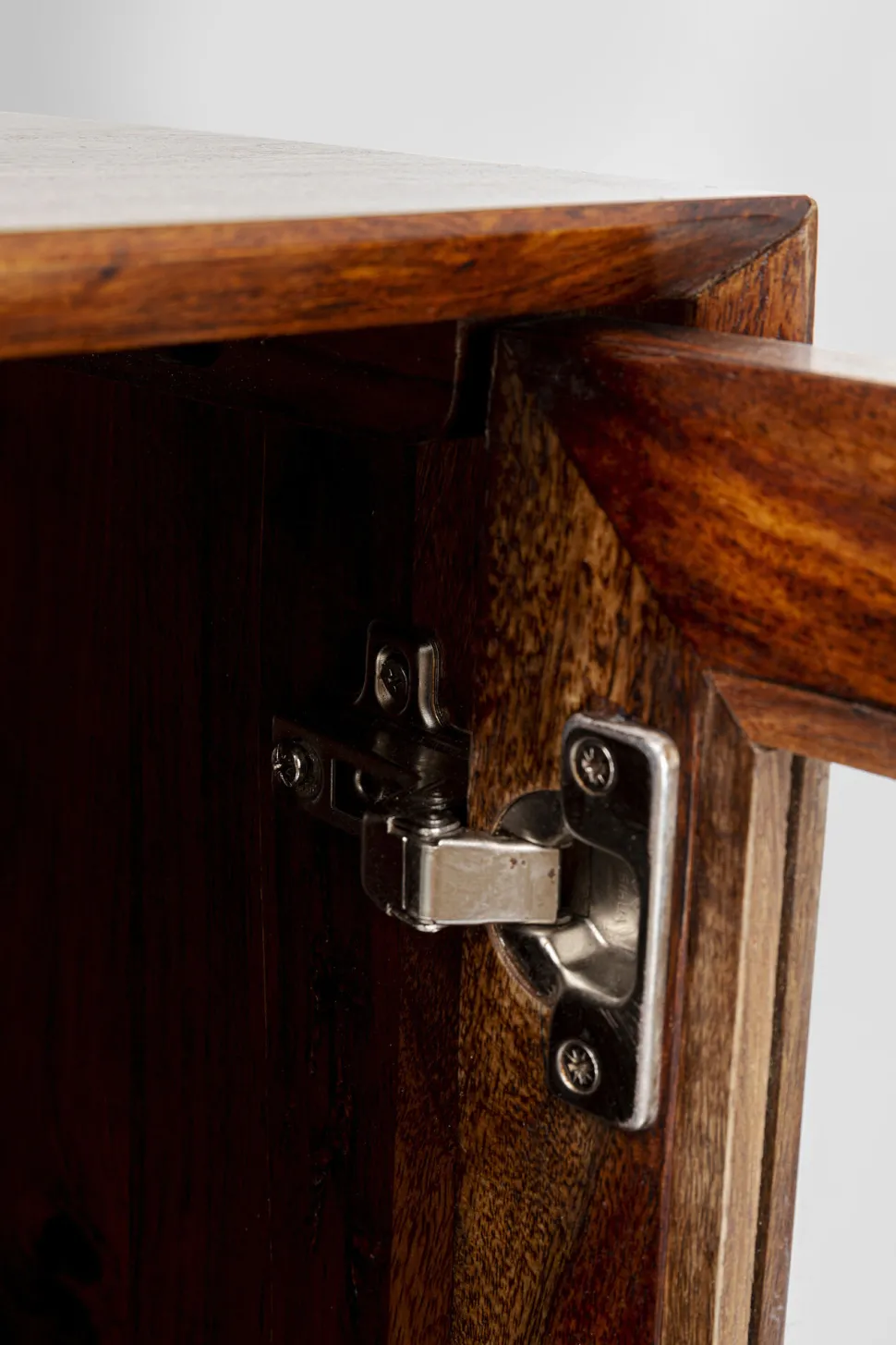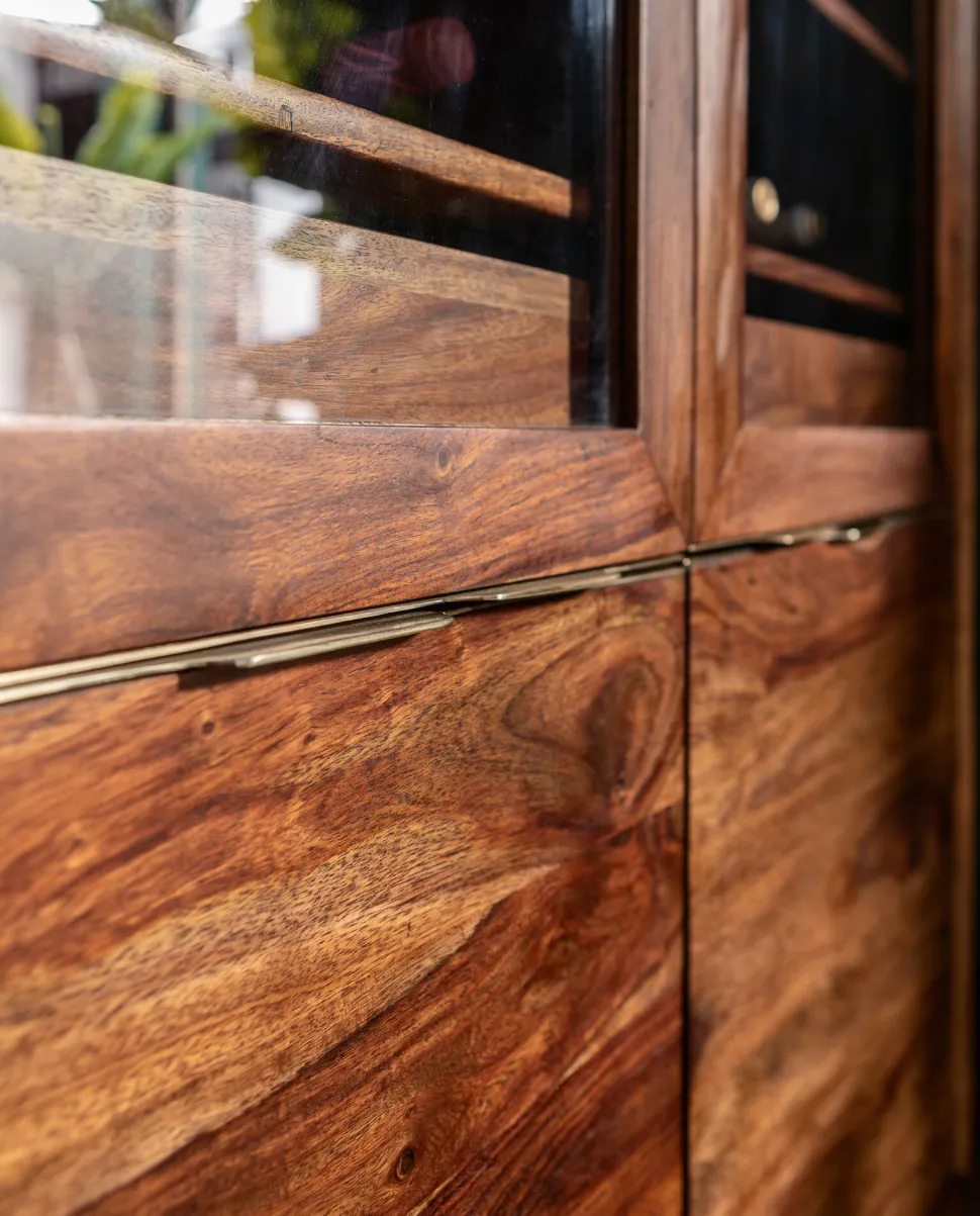 - Funktional: Flaschenhalter und Schübe hinter den Glastüren, vier Ablagefächer hinter den Holztüren
