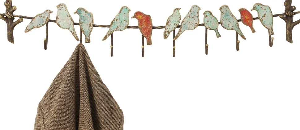 - Braune Garderobenleiste aus Stahl im Vintage-Stil mit niedlichen Vogelfiguren in zartem Mint-Grün und Rot