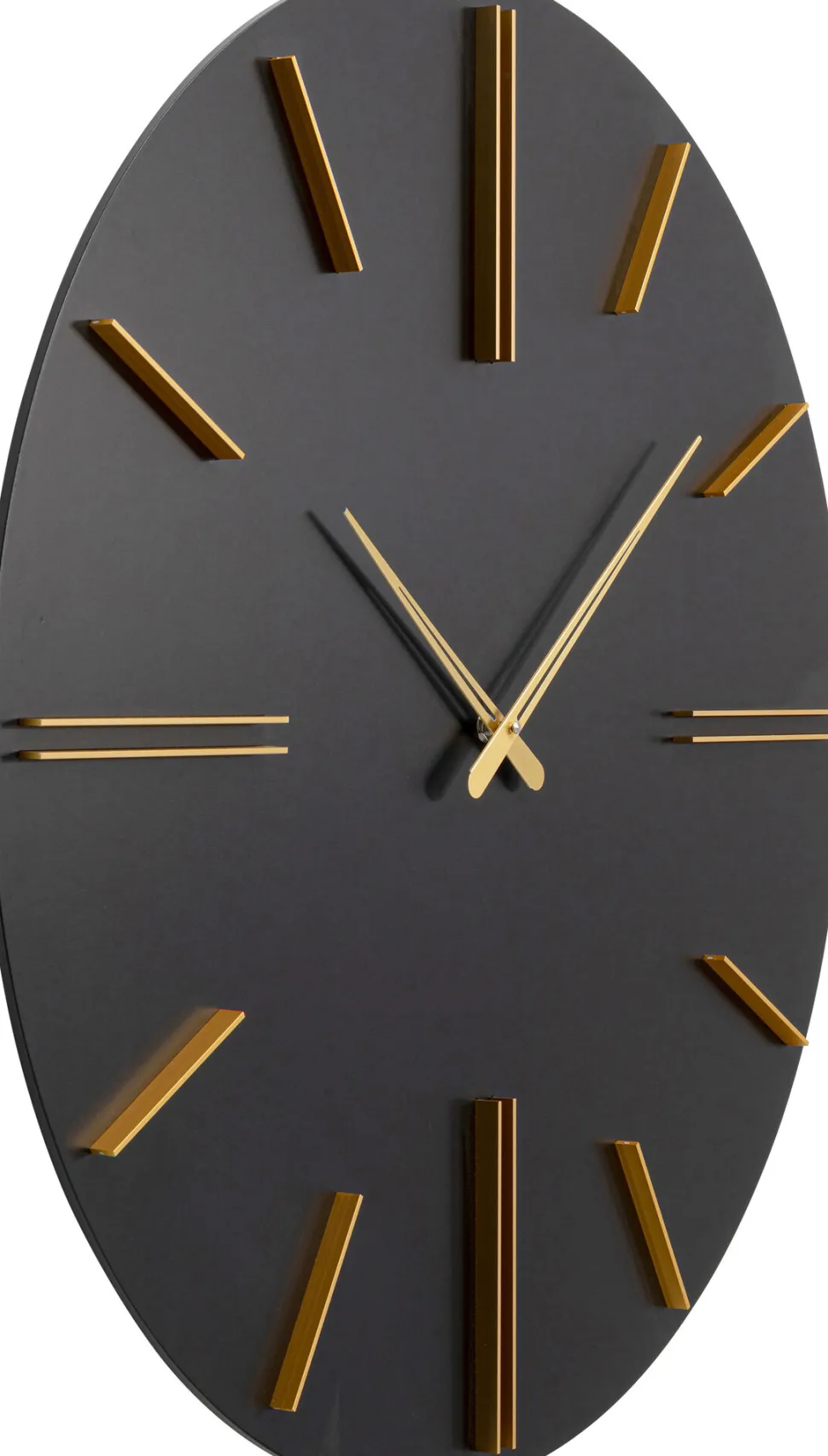 - Runde Wanduhr in Schwarz mit goldenen Details, 70 x 70 x 4 Zentimeter (H/B/T)